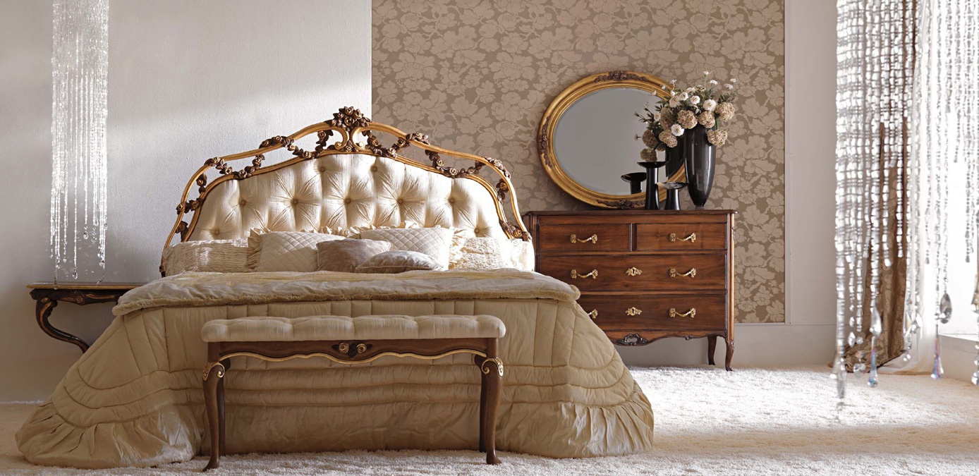 Headsets for bedrooms from Italian manufacturer Savio Firmino. Consists of double bed, bedside console, bench, mirror, chest. Frame all products are made of solid wood. As decoration is hand carved. Upholstery - textiles from the company portfolio. Accessories metal gold plated. Set made in a classic style. A perfect choice for a sophisticated bedroom.