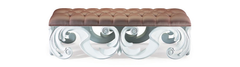 Bench Naxos from producer Christopher Guy (Harrison & Gil). Bench upholstered range of companies. The seat is decorated with ornamental stitch-Capito. Legs - natural wood. Decorative elements thread of manual work. The surface is varnished in white. Colours in stock.
