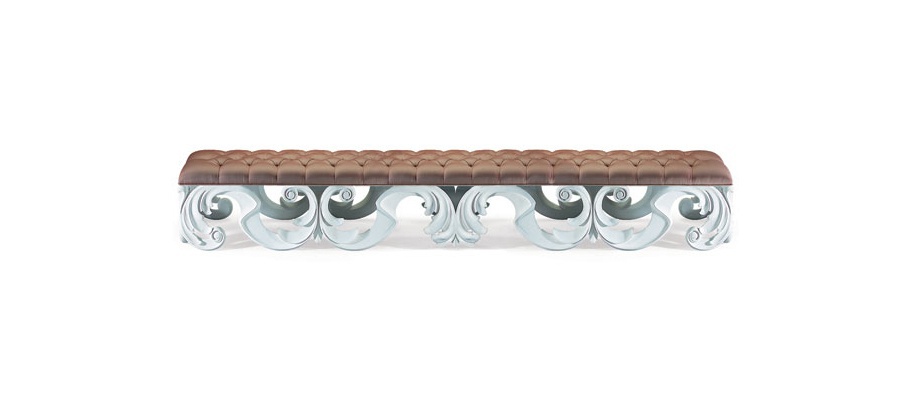 Bench Naxos from producer Christopher Guy (Harrison & Gil). Legs - natural wood. Decorative elements thread of manual work. The surface is varnished in white. The seat is upholstered with fabric and is embellished with stitch-Capito. The model is made in art Deco style. Colours in stock.