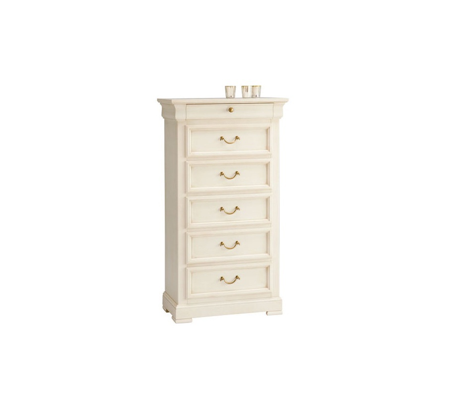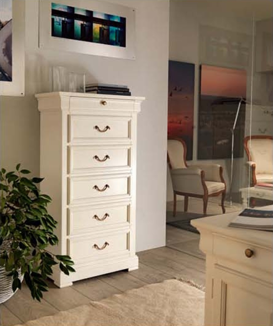 A chest of drawers from Italian manufacturer Selva. Presents high model in white with large drawers. The frame is made from Tulip tree. Finishing of the facade with wood veneer. The entire surface is lacquered. The style is classic.