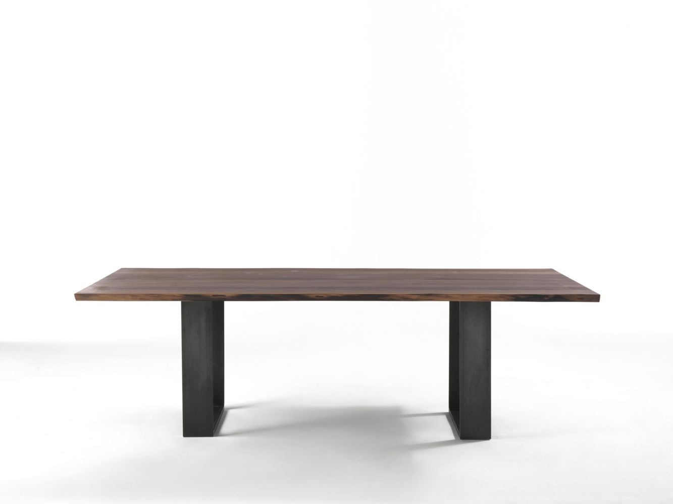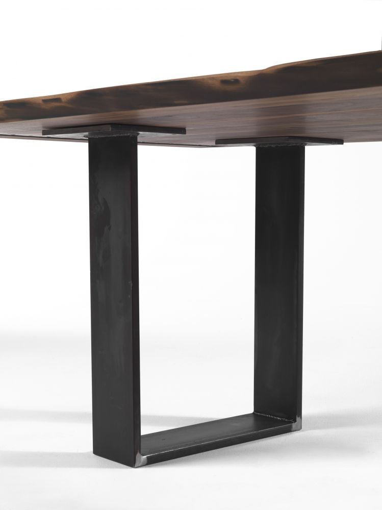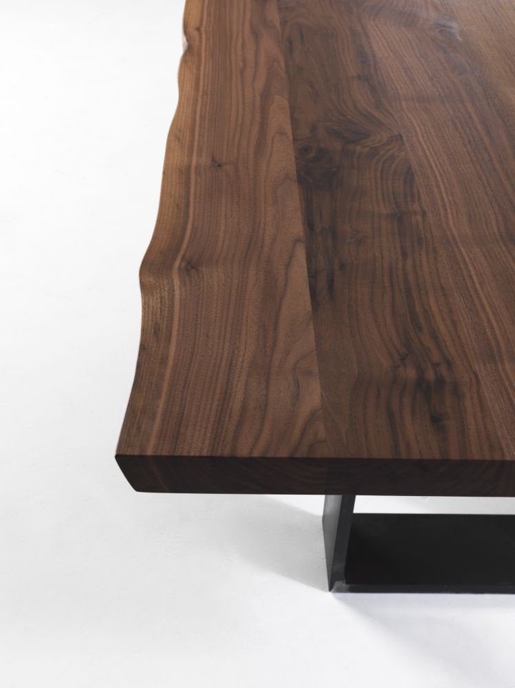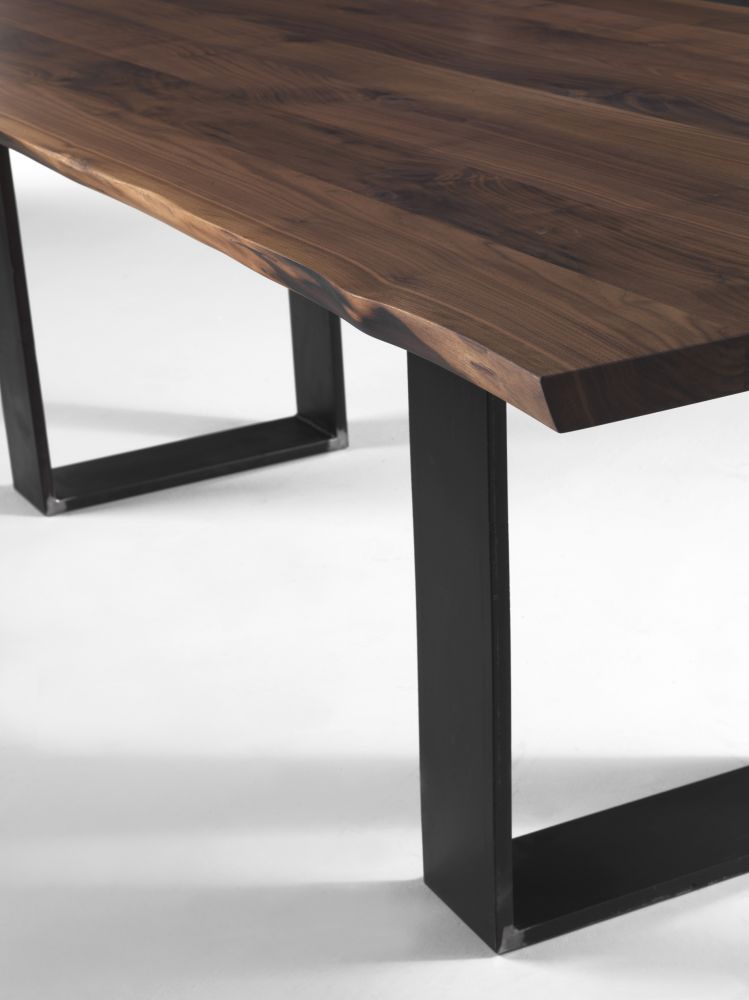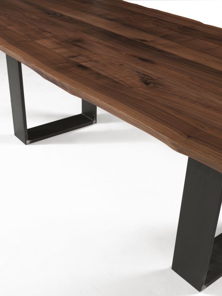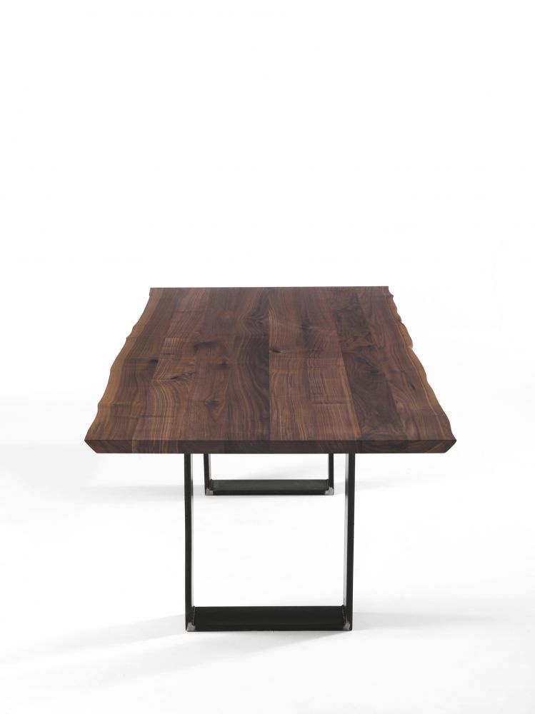 Table Newton Natural Sides from the Italian manufacturer Riva 1920. Model dining with rectangular table top. Worktop 5 cm thick, made of solid oak or walnut with knots. The edge countertops have a natural shape. Supports are made of iron and covered with a finish line on the company directory.