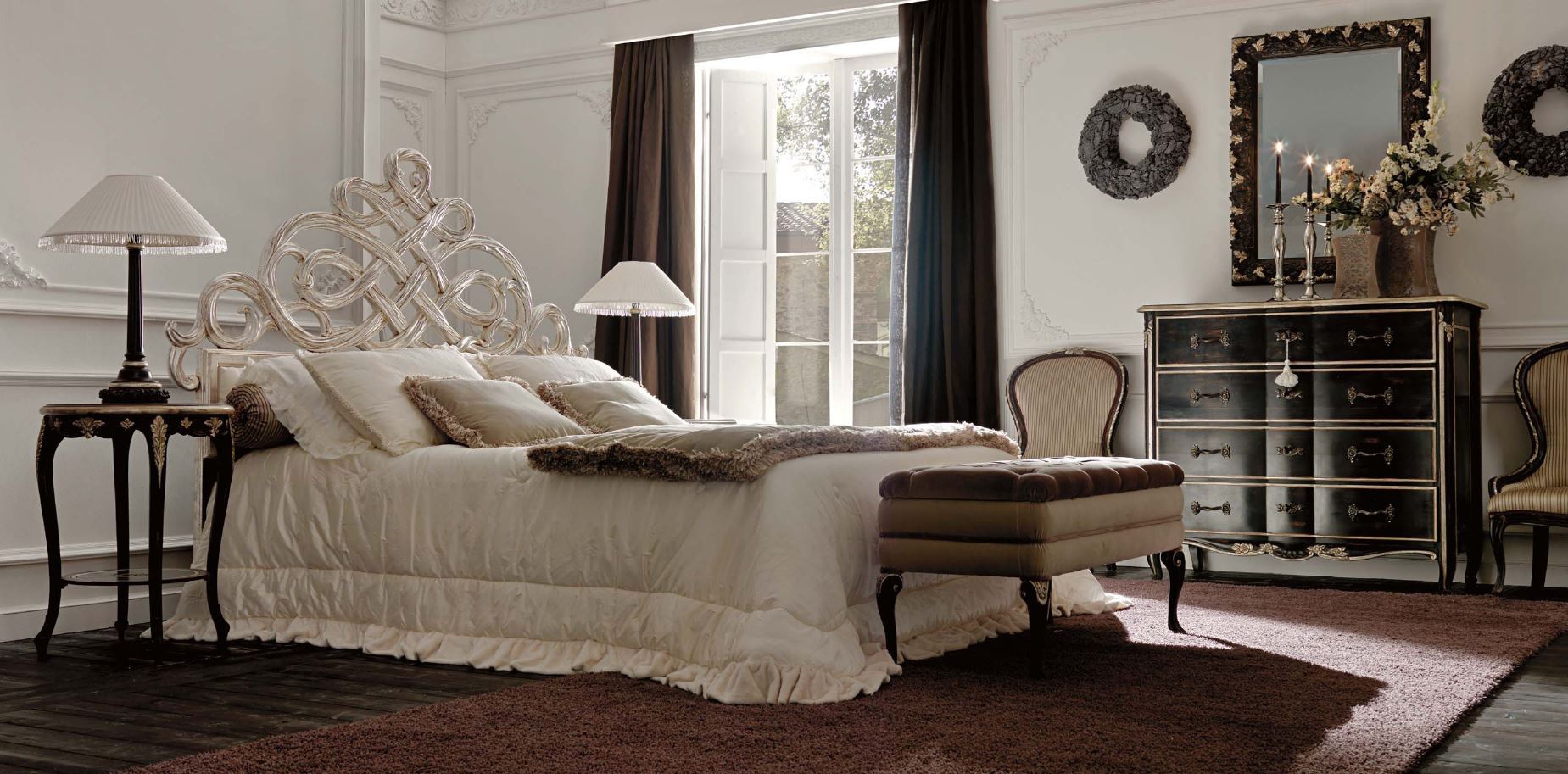Headsets for bedrooms from Italian manufacturer Savio Firmino. Consists of double bed, bedside table, chest of drawers, mirror, bench with a niche for storage of chairs. Frame products made from solid wood. Products legs and headboard with decorative hand carved. Upholstery textile. Color to be selected from the range of the company. Set made in a classic style.