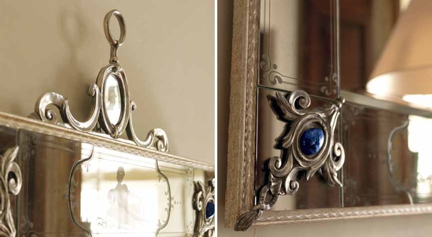 The mirror from the Italian manufacturer Savio Firmino. Model wall-mounted , rectangular, frame made of metal. Colors: silver, gold. The model is decorated with handmade engraving.