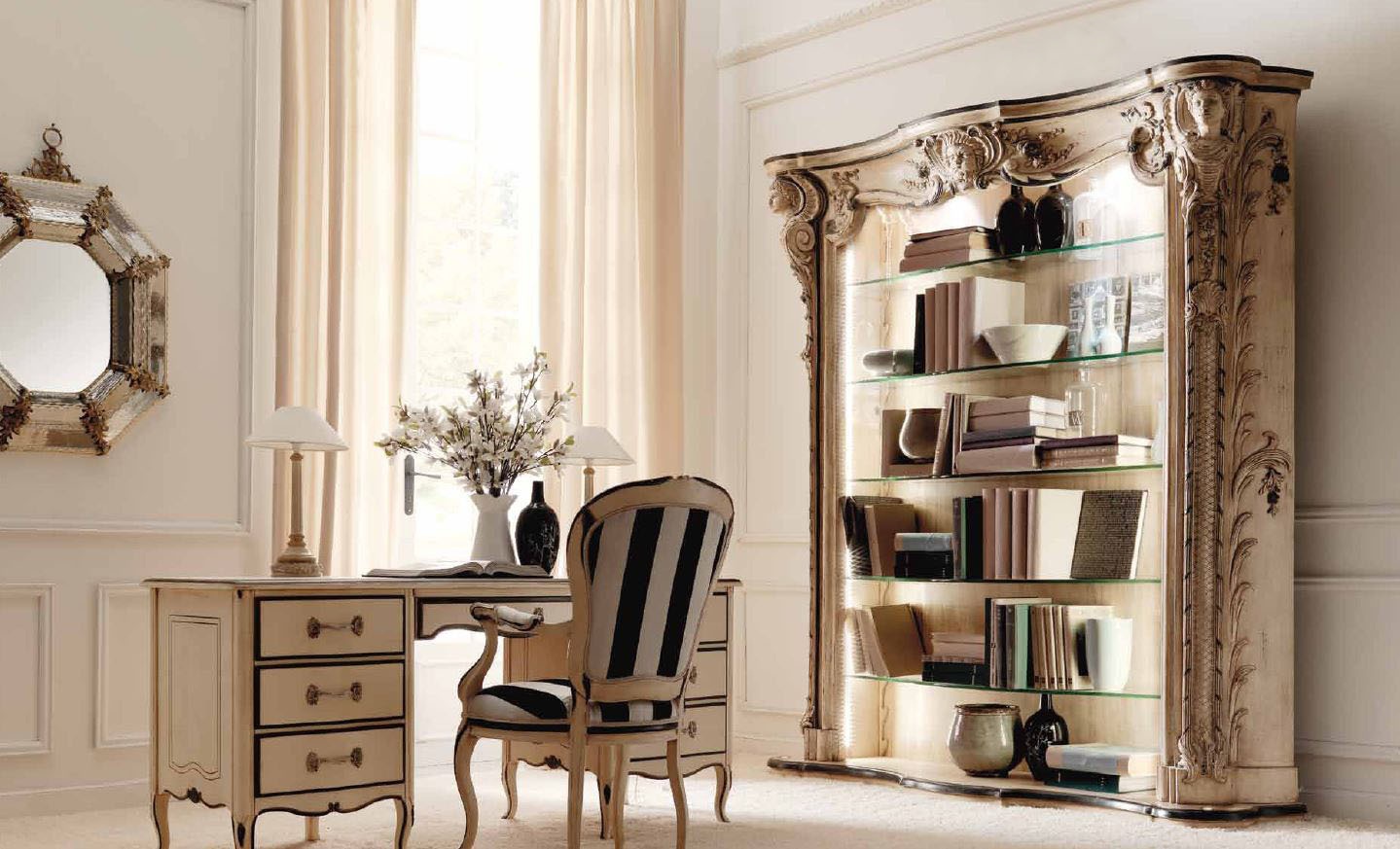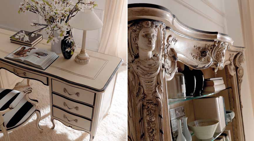 Headsets for the office from the Italian manufacturer Savio Firmino. Consists of Desk, chair, book rack. Frame, legs products made from solid wood. Upholstery - textiles. Filler - polyurethane foam. Shelf rack - glass. Color option - to choose from a range of companies. Decor stands hand carved. Set made in a classic style.