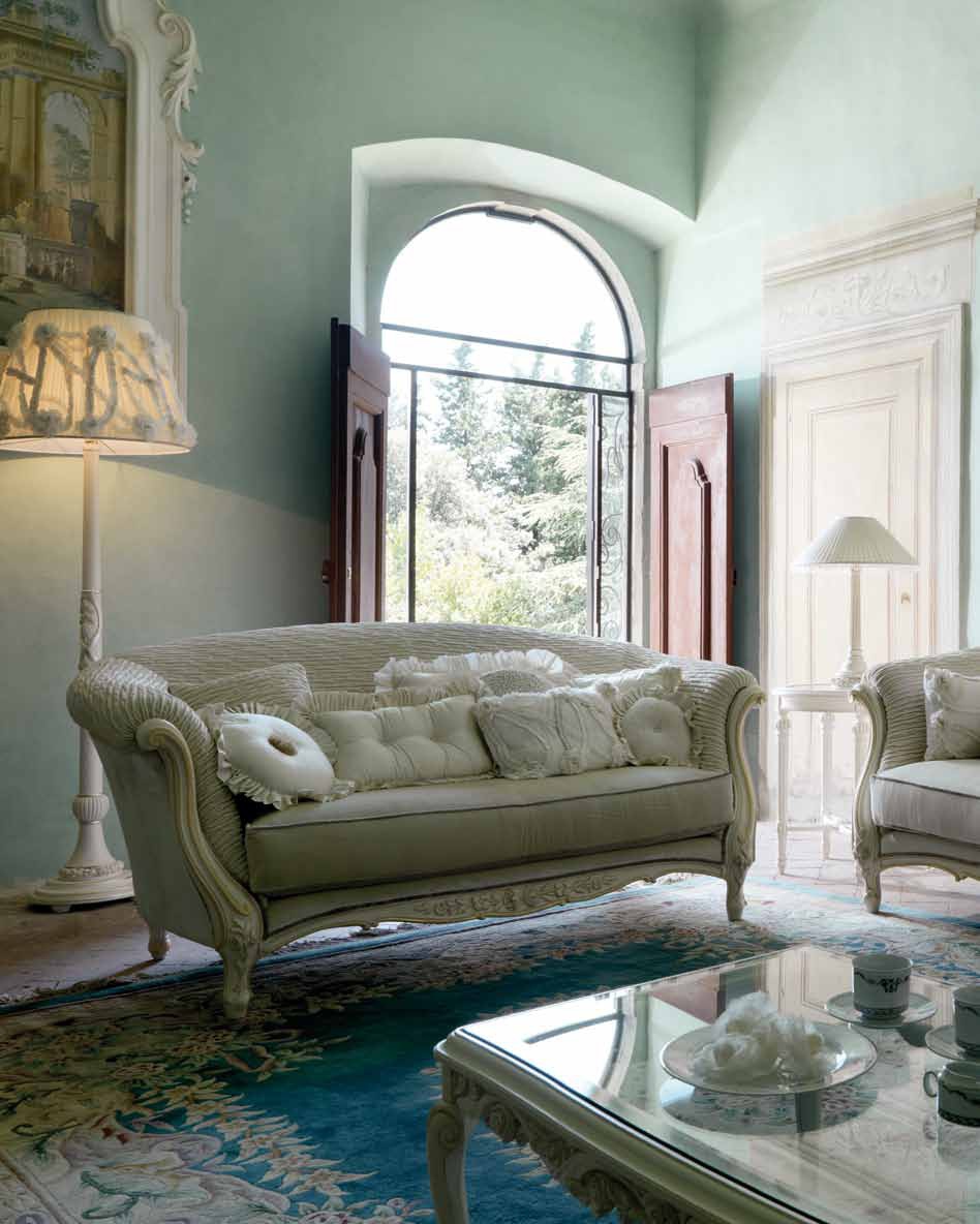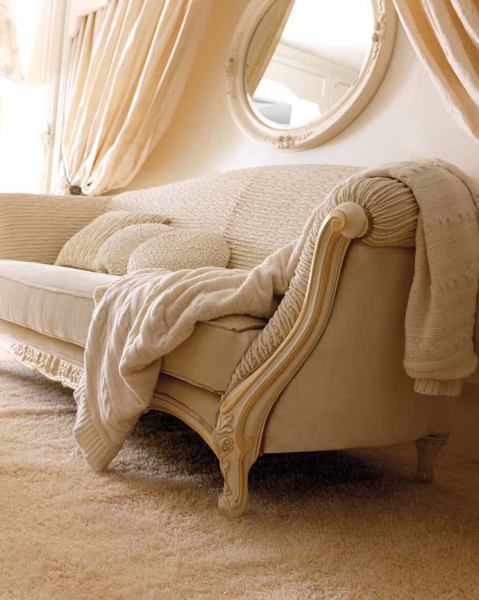 Two-seater sofa from Italian manufacturer Savio Firmino. Model on wooden frame. Low carved legs. Upholstery models of high quality textiles. Coating wooden surfaces varnish. Decor - hand carved, gold leaf. The model is made in classic style.