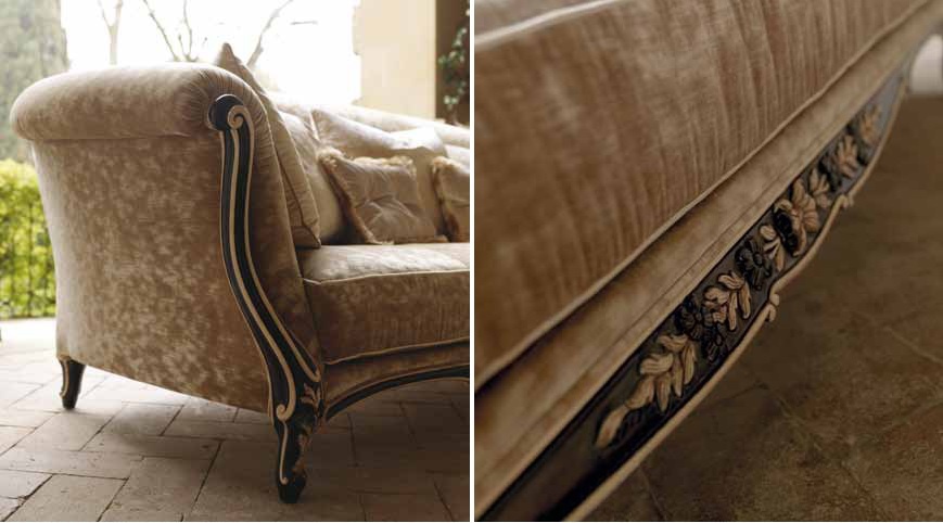 Three-seater sofa from Italian manufacturer Savio Firmino. Model on wooden base, with shaped legs low. The upholstery is made of high quality textile/leather. Coating wooden surfaces varnish from the company portfolio. The decor presents a hand-carved, covered with gold leaf. Model in the classic style.