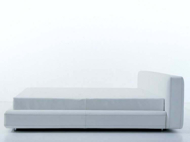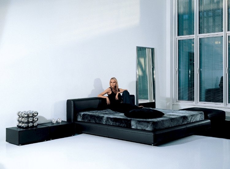 Double bed Moon from the Italian manufacturer Rivolta. Bed with high headboard. The frame is made from beech or pine. Legs of chromed steel. As the upholstery used is genuine leather. Filling - polyurethane foam. The style is modern.