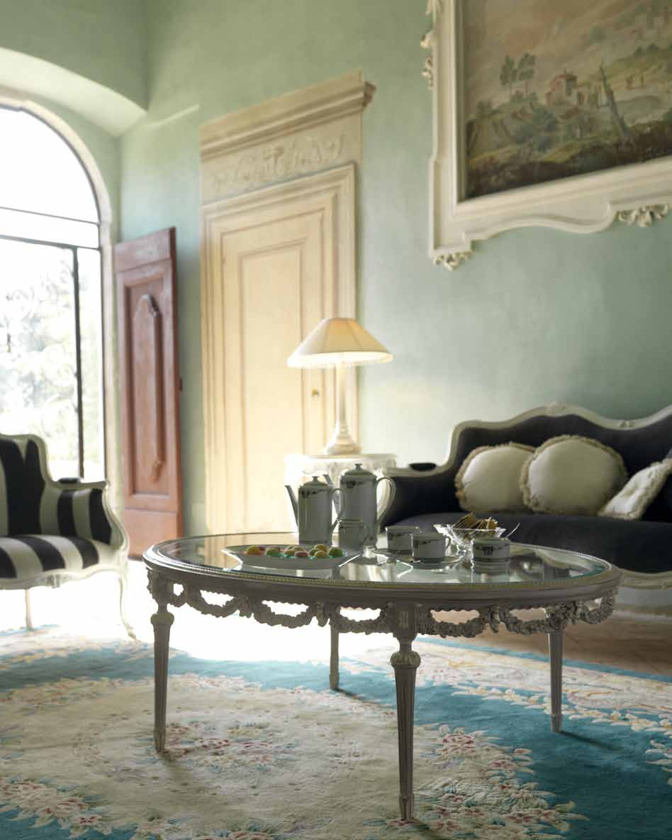 Sofa set from the Italian manufacturer Savio Firmino. Consists of 2 seater sofa, armchairs, coffee & side tables, benches. Frame, legs products made of solid wood. Upholstery - textiles. Color option - to choose from a range of companies. Decor - hand carved, covered with silver leaf. Set made in a classic style.