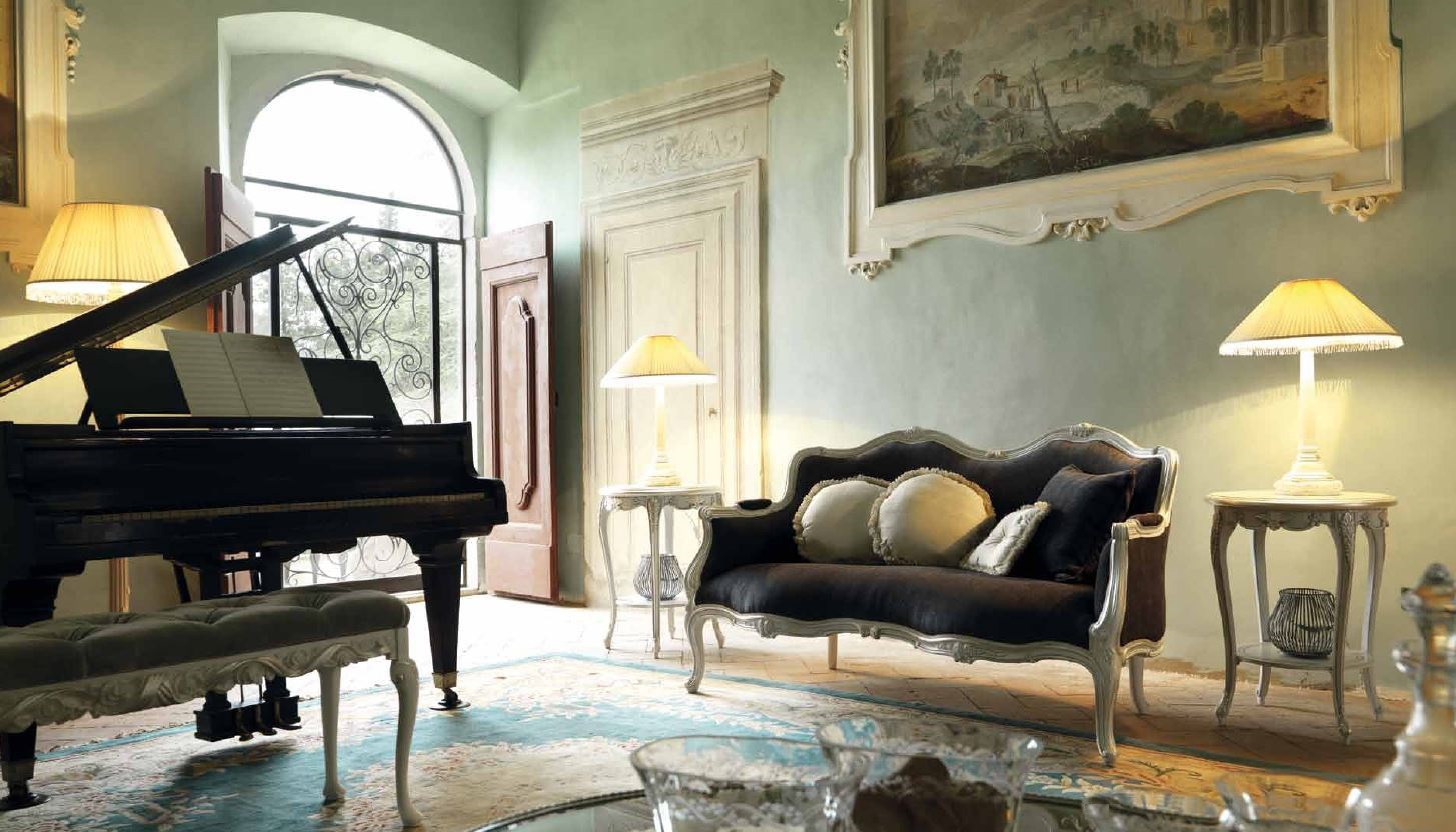 Two-seater sofa from Italian manufacturer Savio Firmino. Frame, legs products made of solid wood. Upholstery - textiles. Color option - to choose from a range of companies. Decor - hand carved, covered with silver sheet. The sofa is made in a classic style.