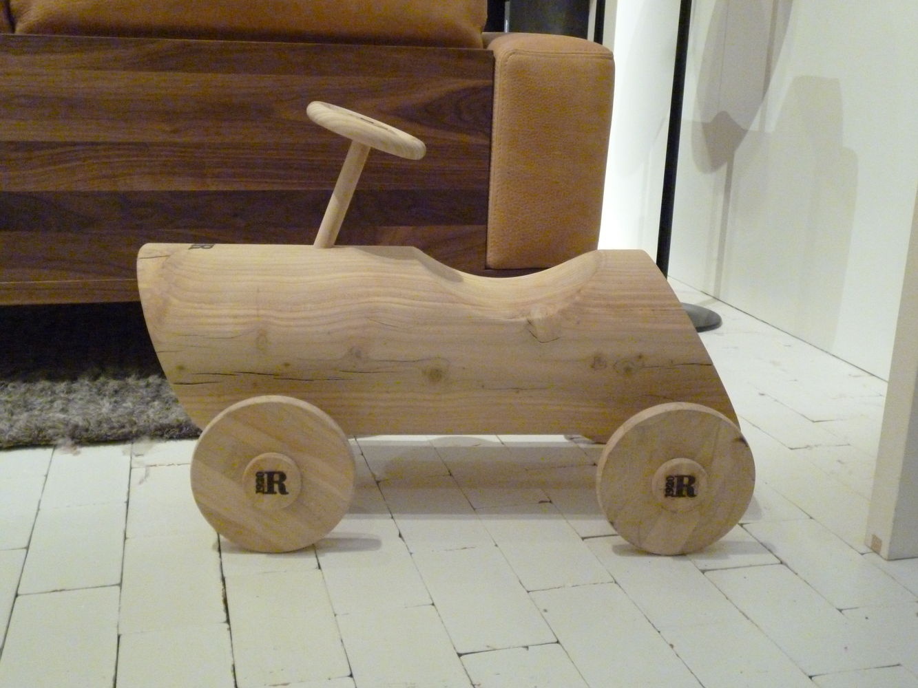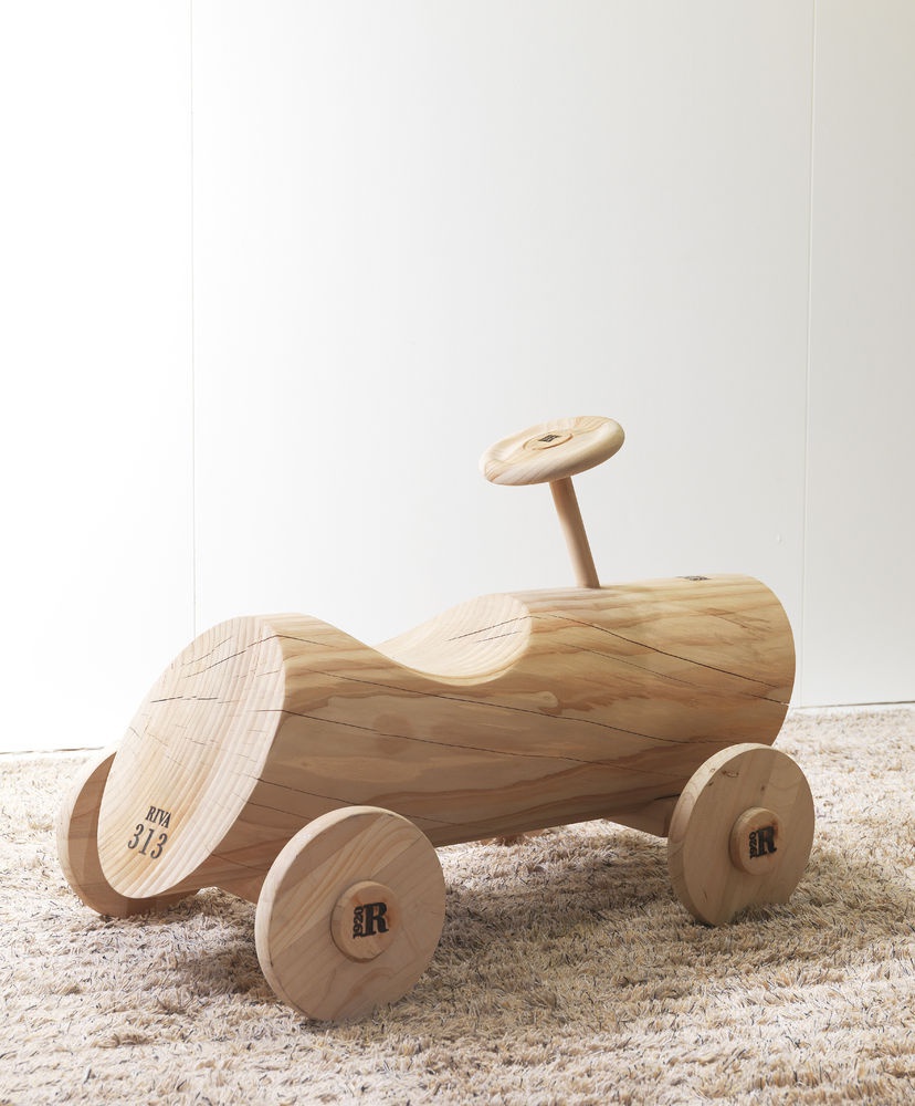 Children's furniture R 313 from the Italian manufacturer Riva 1920. The car is on wheels for children carved from the trunk of the cedar. This model may provide a first tactile experience for the little ones. After sitting at this machine you can feel the unforgettable flavor and texture of this wood.