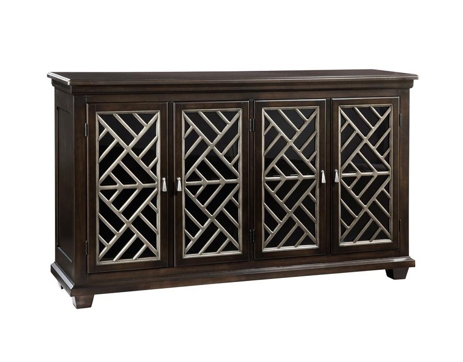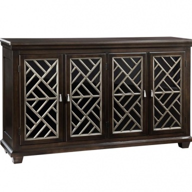 Transitional Entertainment console from an American manufacturer Hekman Furniture. Designer rectangular console executed in the Greek style, surely will beautify living room, dining room or hall. Strict classical form console allows you to fit it into the finished interior. The console is made of hardwood and finished in black veneer. Carved base and legs, table top with carved rim. Four hinged glazed doors decorated with geometric pattern, a surface of the metal. Behind each door is a shelf. Careful selection of highly qualified professionals and follow the traditions of world cultures - that's the key to success and longevity of the company Hekman Furniture world market furniture manufacturers.