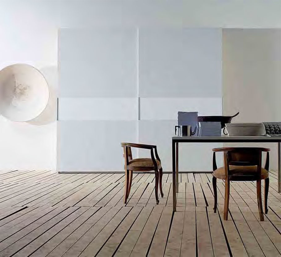 Wardrobe Band from the Italian manufacturer features tisettanta furnishings. Model with sliding shutters. The body is made of wood. Finish - white lacquer. Sash with frosted glass. Custom closet in a modern style.