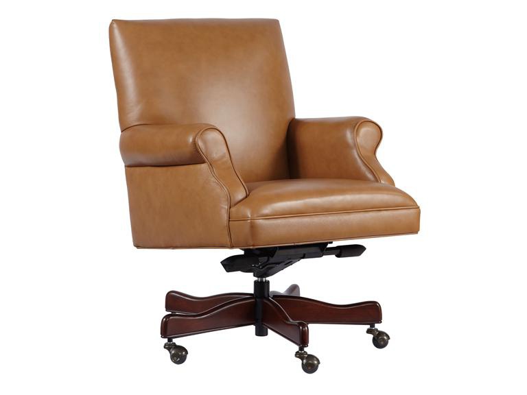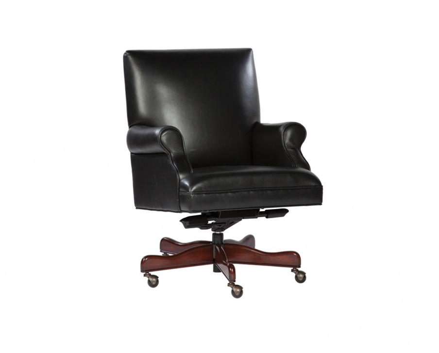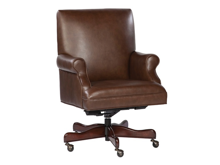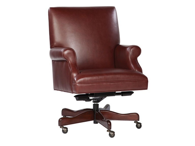 Chair office Executive from an American manufacturer Hekman Furniture. Office chair on rollers, furnished in classic style, is appropriate as a home office, and in the working office environment. Comfortable seat, high back, padded armrests; five-point base is made of wood and mounted on rollers. To achieve a comfortable position using pneumatic lifting mechanism and the tilt mechanism of the knee. The chair is upholstered in beautiful leather color in stock. Careful selection of highly qualified professionals and follow the traditions of world cultures - that's the key to success and longevity of the company Hekman Furniture world market furniture manufacturers