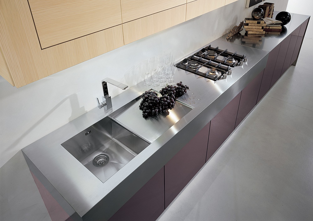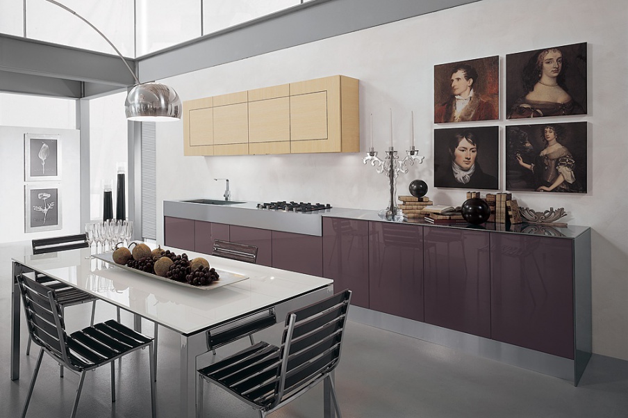 Kitchen Larice from the Italian manufacturer Aster Cucine. The facade of the kitchen is made of laminate . The table top is made of stainless steel. The colour of this model of Burgundy.