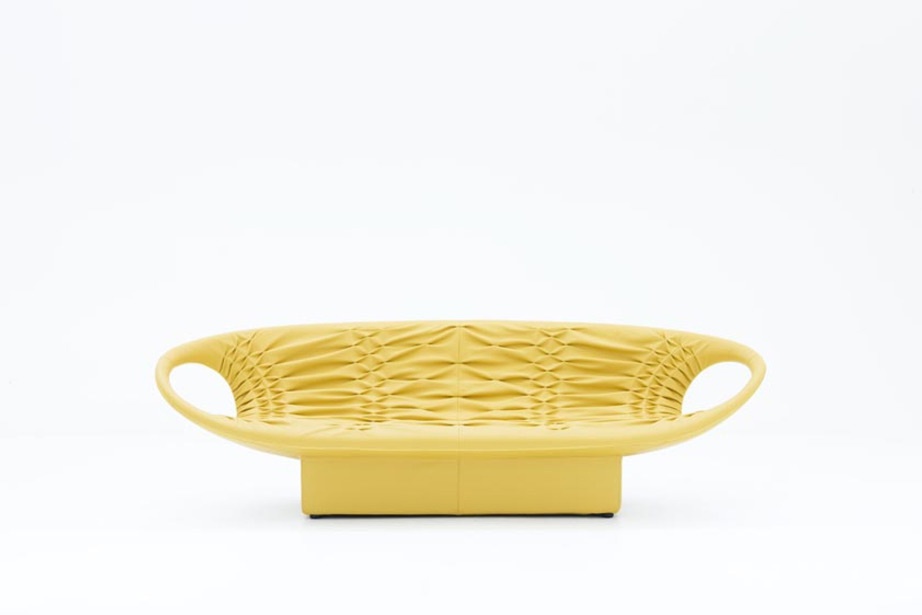 The Smock sofa from Italian manufacturer Moroso. Design proposal from Patricia Urquiola. Steel base painted in white, black, red or purple color. Pads on legs made of polypropylene. The seat frame is made of steel with a filler of polyurethane foam. The upholstery is available in leather or textile, steel armrests are covered with skin, colors to choose from manufacturer's catalogue. Removable upholstery with zip, making it possible to combine different materials. Elegant and graceful sofa will beautify your modern living interior.