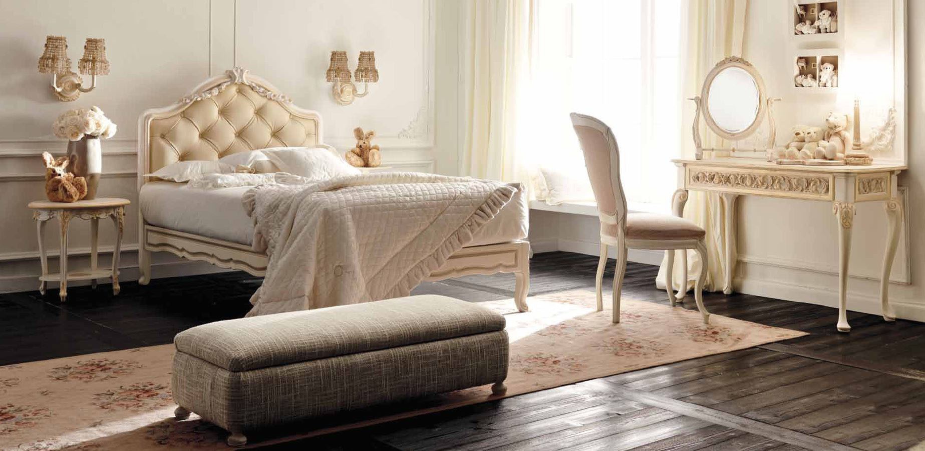 Single bed from Italian manufacturer Savio Firmino. Bed with high upholstered headboard. Frame, legs made of solid wood. Upholstery headboard - textiles. The decor presents a graceful hand-carved, lacquered and gold leaf. Colours in stock. The model is made in classic style.