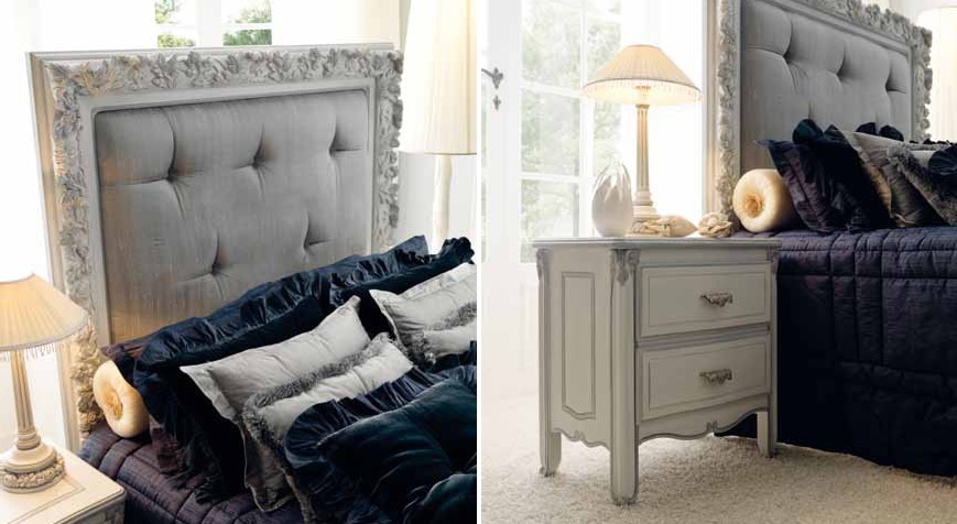 Headsets for bedrooms from Italian manufacturer Savio Firmino. Consists of single bed, Desk, stool, mirror, chairs and bedside tables. The frame and legs are made of solid wood. Headboard is soft, high, adorned with decorative carvings and with stitch-Capito. Upholstery textile from the company portfolio. Accessories metal. Set made in a classic style. Colours in stock.