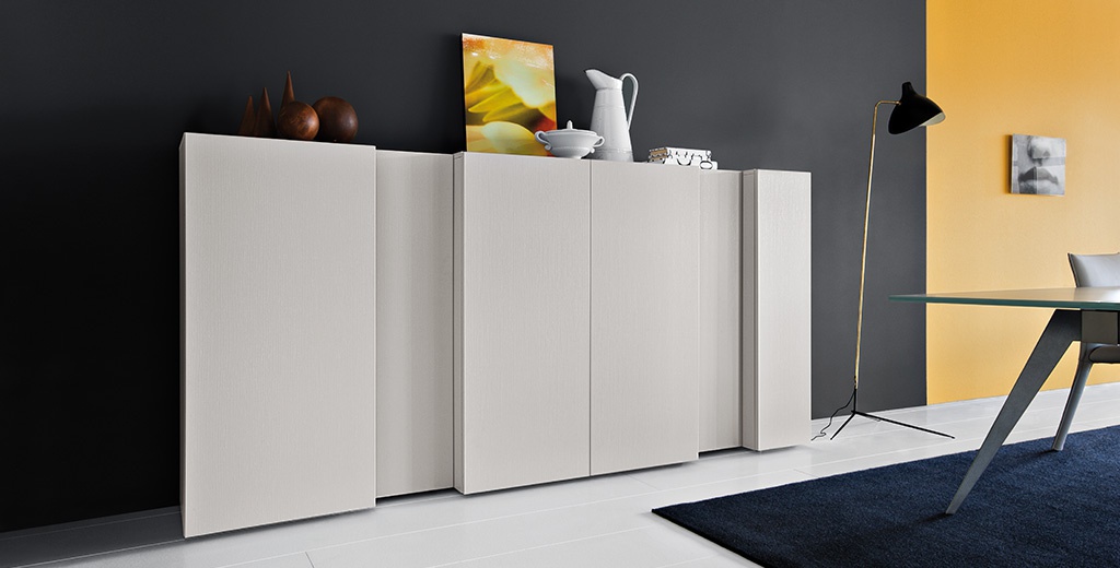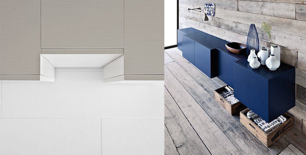 Modular system Spazio volumi from the Italian manufacturer Pianca. Furniture made of natural wood. Floor modules with hinged doors. Also available in a version with wall modules with hinged doors. Color in stock, the model in blue and white. Modern style, bright accent in Your interior.