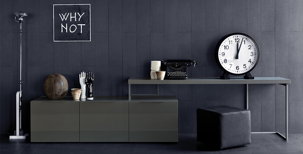 Modular system Spazio lineare from the Italian manufacturer Pianca. The furniture includes cabinets with hinged doors and chests with drawers. The number of modules and composition — at the request of the customer. Finish options: glossy / matte lacquer / wood veneer. Modules with base in chromed metal and glass and / or stone. Color white, gray, variations on the number of items. Modern style.