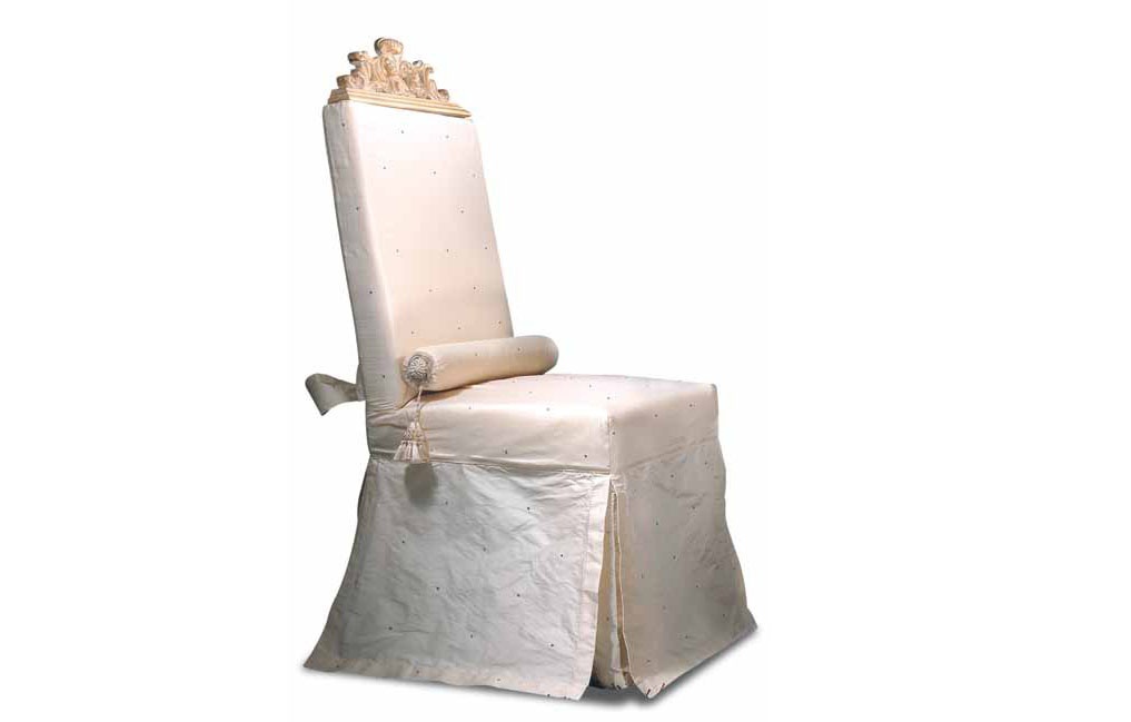Set for the dining room of the Italian manufacturer Zanaboni. The presented model round dining table and chairs. The table is made of wood with countertop of the massive, round. Chairs with high backrest with decorative elements made of wood with a Golden coating. The upholstered chairs from top quality textiles, decorated with cylindrical pads and ribbons tied on the backs. A wonderful addition to the interior dining room made in classic style.