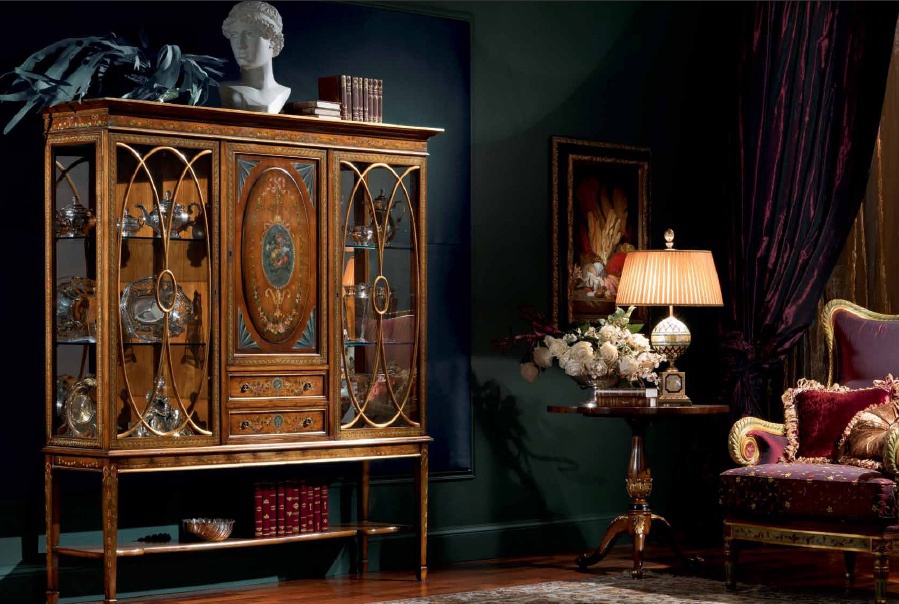 Showcase for small feet Art. B/903 Italian manufacturer Zanaboni. Presents a model showcase for small feet with wing glass doors decorated with wooden inserts. Color in a light tone of wood. The original solution for the living room in a classic style.