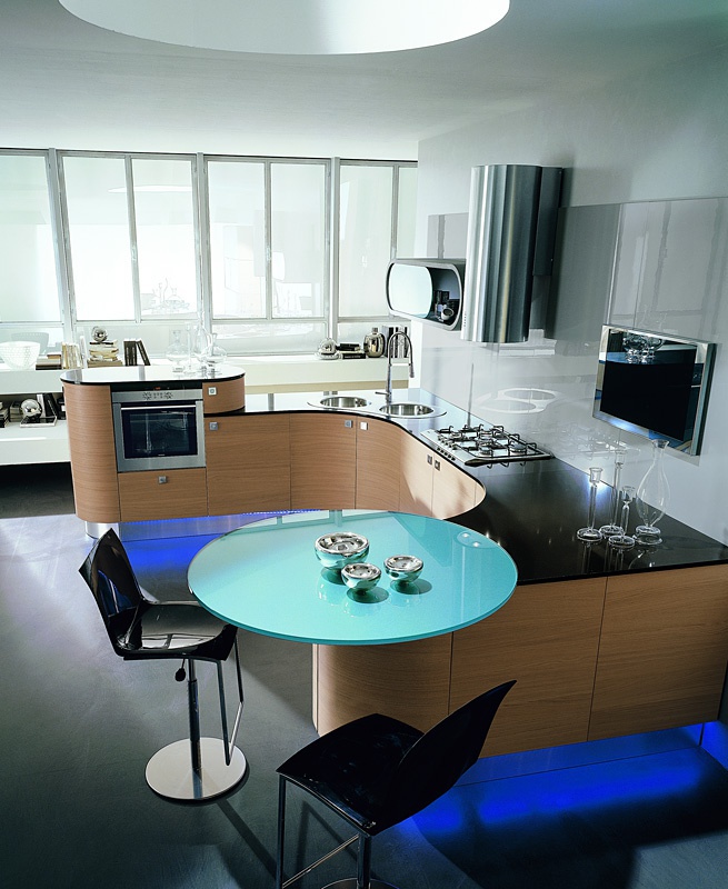Kitchen Acciaio from Italian producer Aster Cucine. The facade is made of veneer wood and cherry. The table top is made of granite. Colors of this model you can choose in the catalog of the manufacturer.