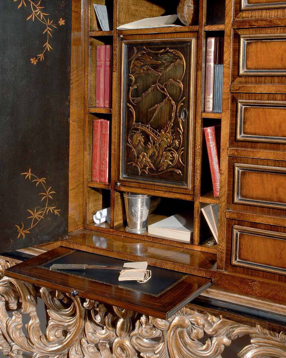 Sofa set Italian manufacturer Zanaboni. The presented model of the secretaire with original design in Baroque style and armchairs with high backs with curved edges. Secretaire fitted with sliding table, pull-out drawers and swing doors. Chair upholstered with high quality textiles pearl color in combination with gold-coated wood. Perfectly complement the interior of the living room.