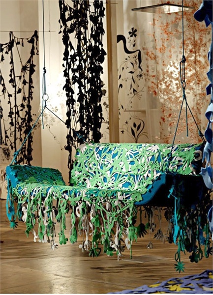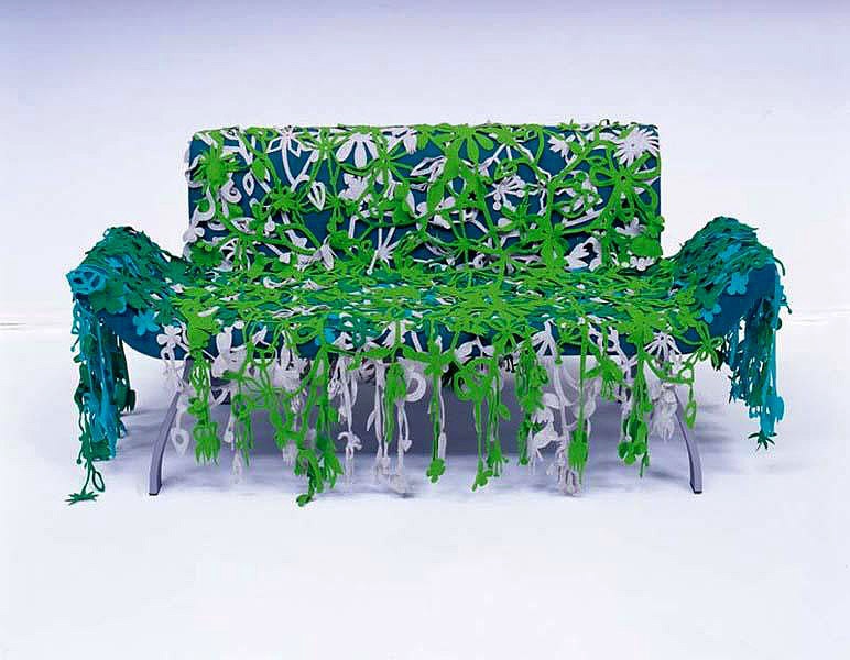 Sofa Tord Boontje Collection from the Italian manufacturer Moroso. Sofa from designer buntje Tord (Tord Boontje). Basic textile upholstery complemented with delicate felt Cape with pattern - signature print artist. The collection also includes armchairs, rocking chairs, chairs in leather and textile upholstery, beds, tables, mirrors (tempered glass with white print) and textile floral decoration.