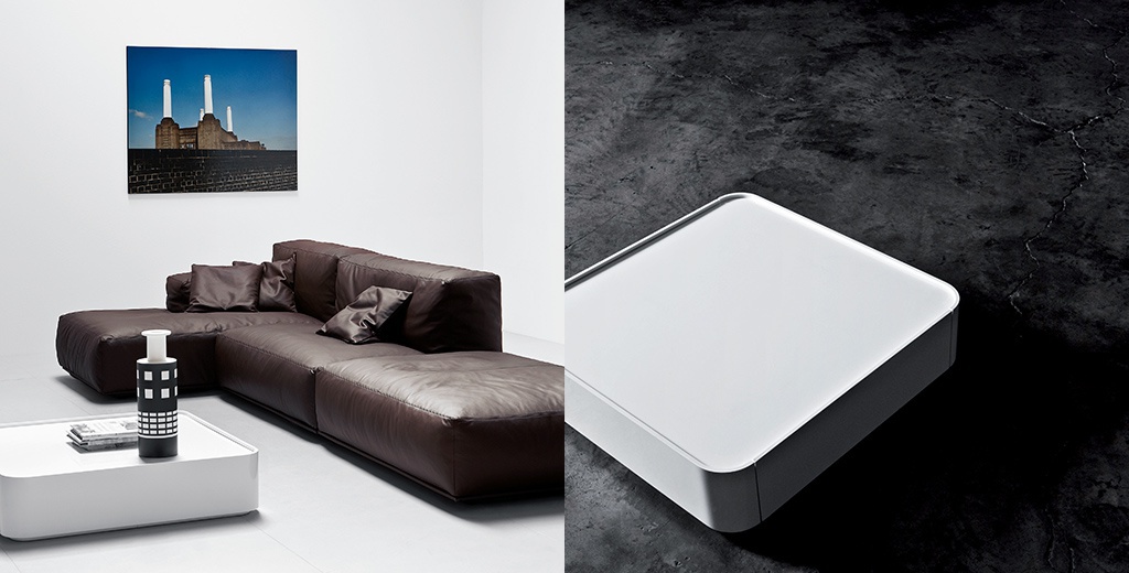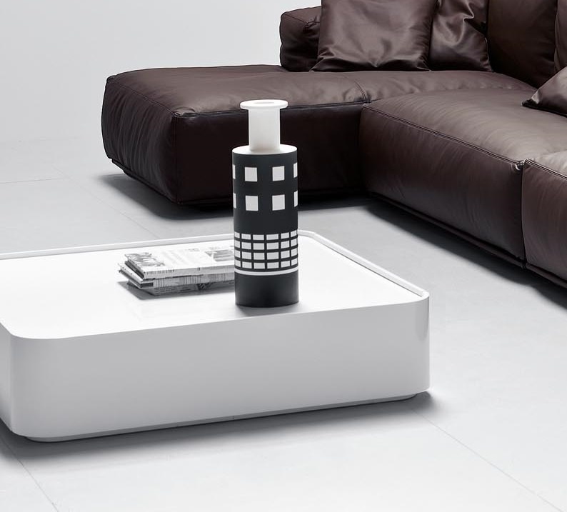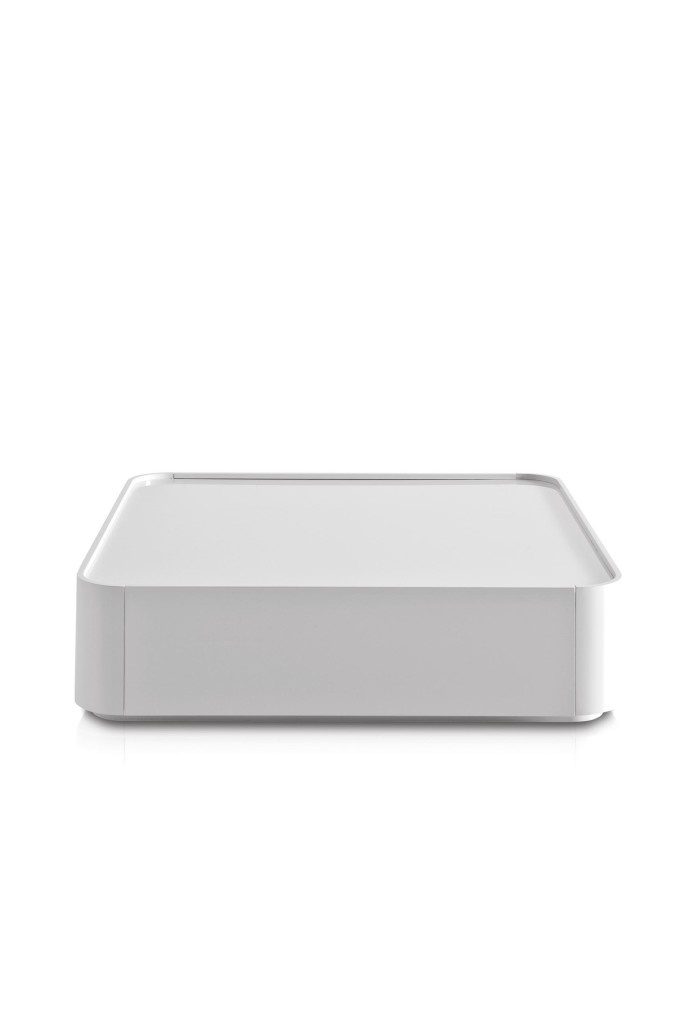 Dedalo coffee table from the Italian manufacturer Pianca. Table made of natural wood and a high gloss finish. The shape is rectangular with smooth corners. Color variations in the catalog of the manufacturer, the model in light beige and white. Table has two drawers for storage. The style of modern furniture.