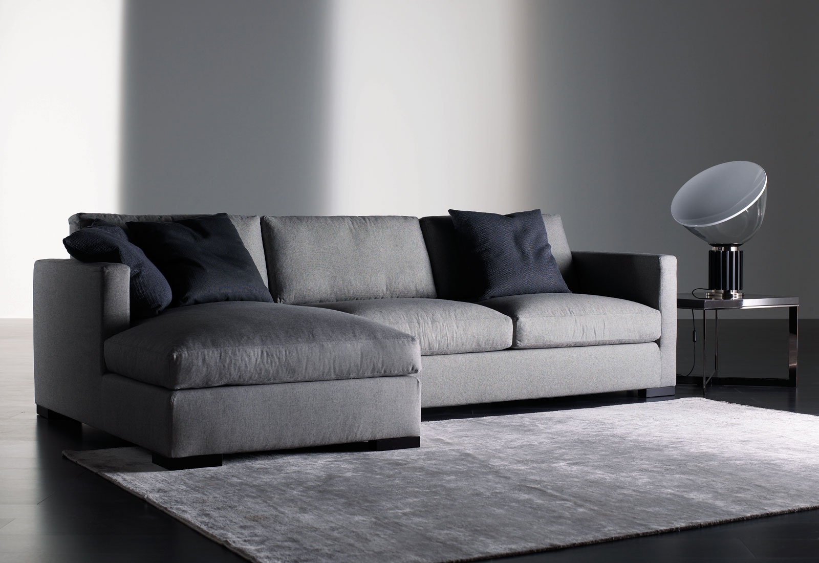 Belmondo modular sofa from Italian manufacturer Meridiani. The frame is made of wood. Upholstery - textiles from a range of campaigns. Filler - polyurethane foam. The corner modular sofa for living room in modern style. The seat cushion and backrest removable. Added comfort decorative pillows. Color scheme, gray and catalogue of the manufacturer.
