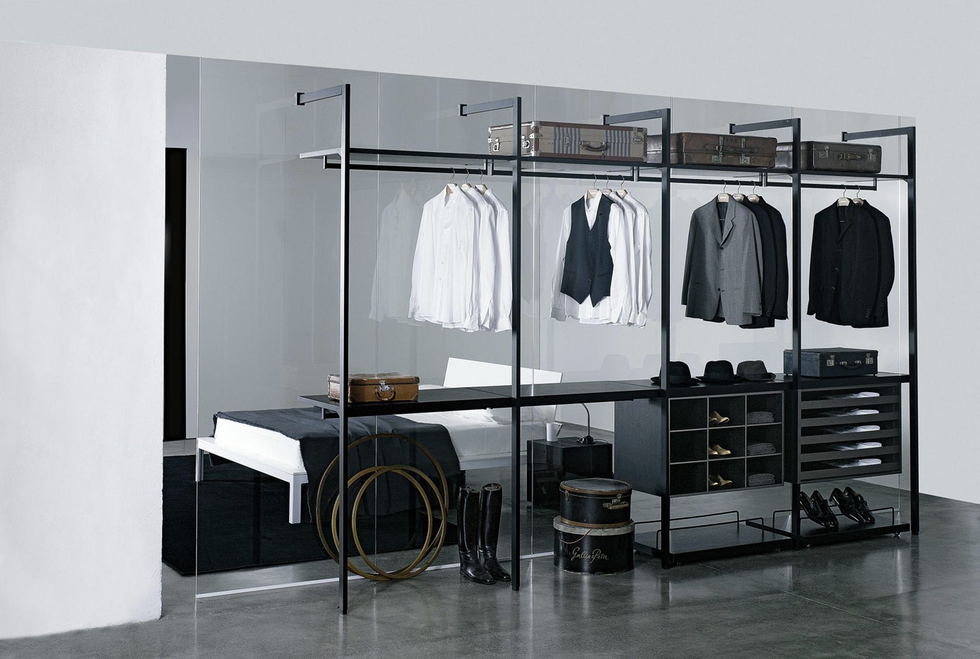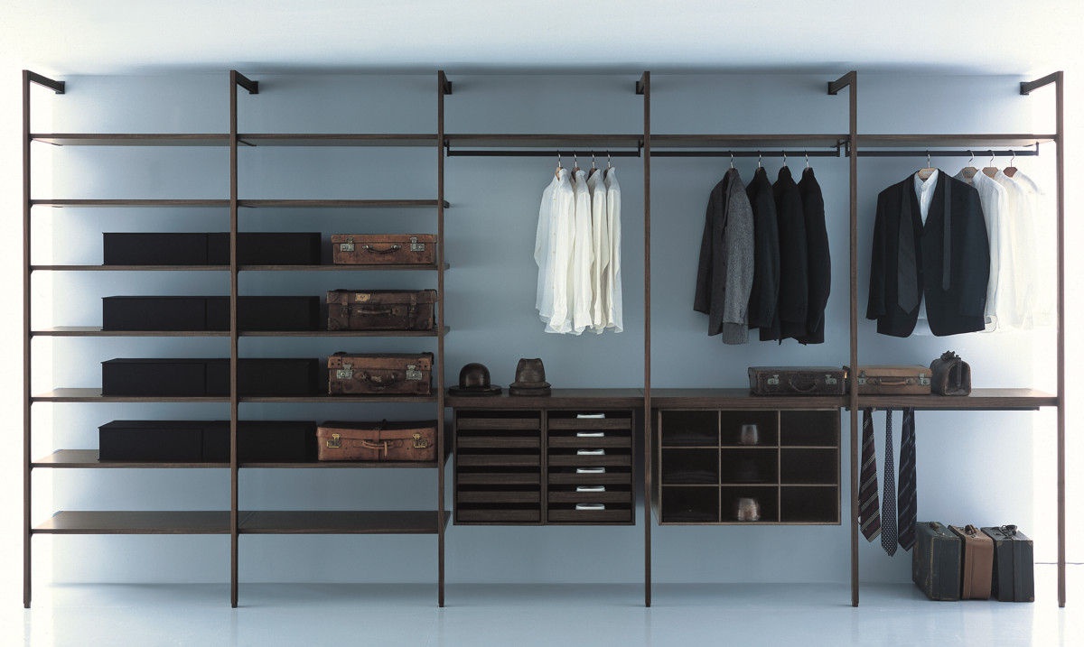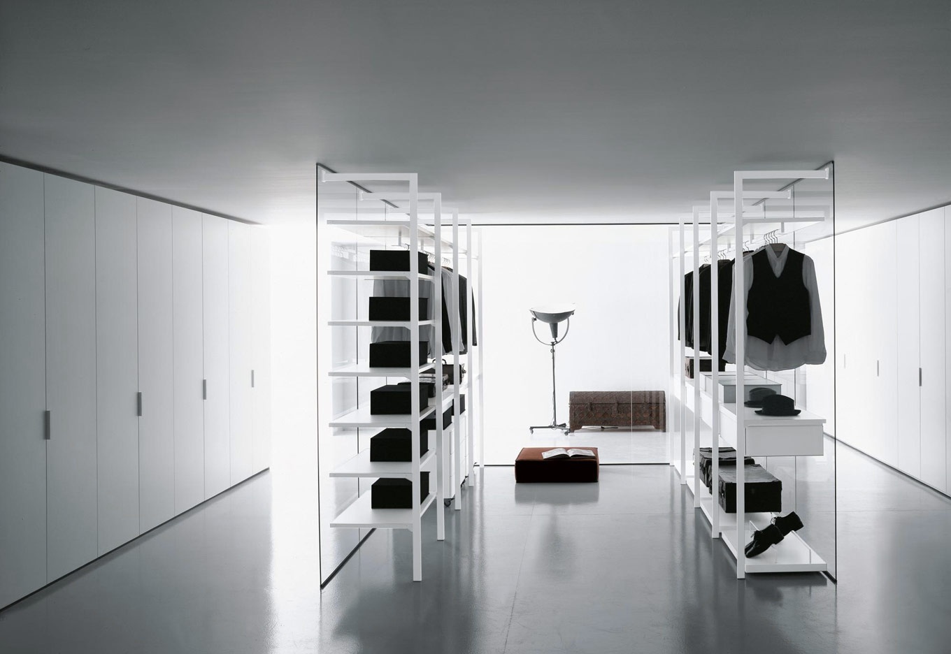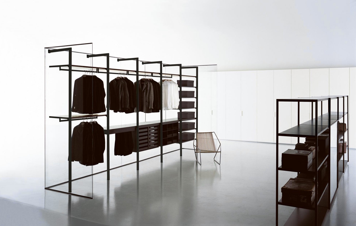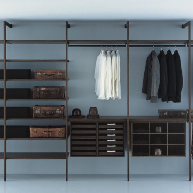 Cabina Armadio wardrobe from Italian manufacturer Porro. Storage, walk-in closet program with a frame made of aluminum and wood veneer exotic wood Mongoi. The program includes shelves and hanging racks. Internal filling, finishing and size on request.