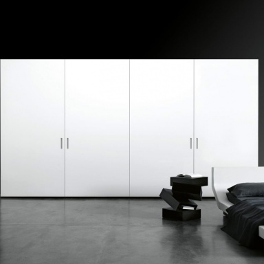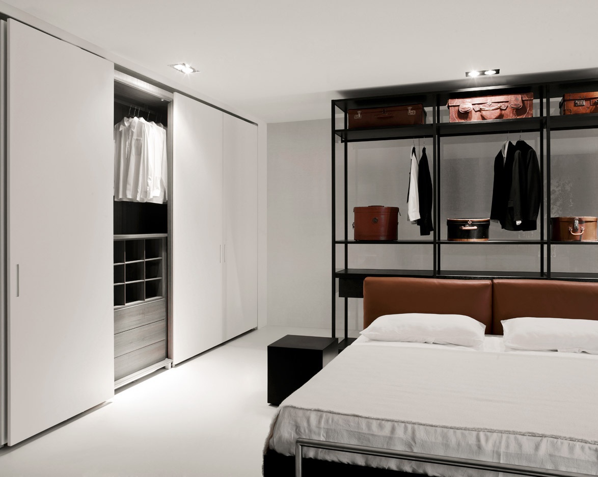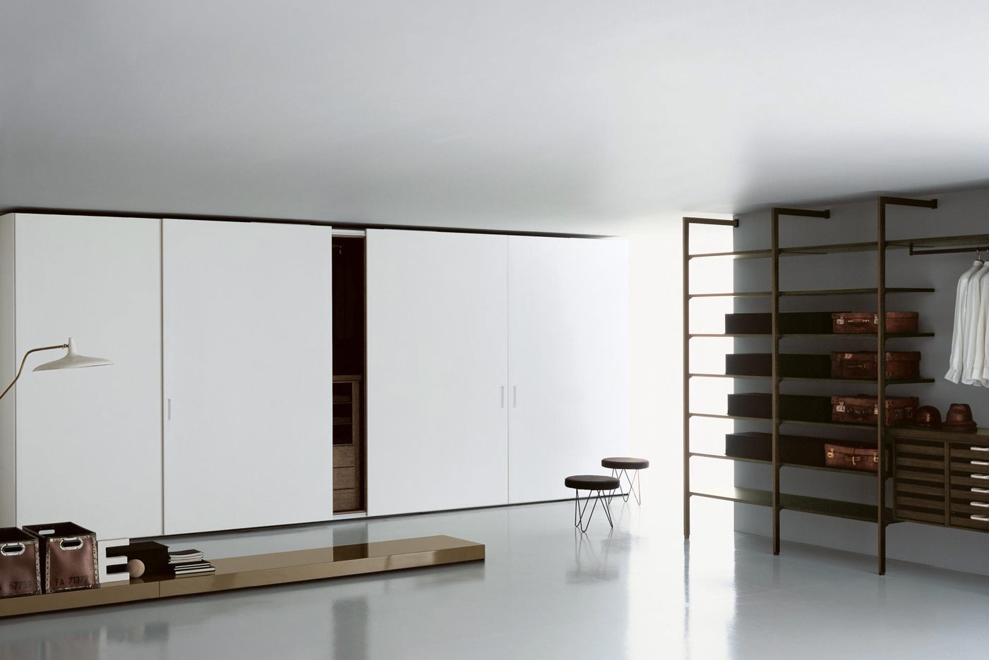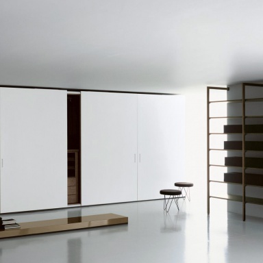 The Complanare wardrobe from Italian manufacturer Porro. Storage system with a frame made of natural wood. An outdoor rack with a frame made of metal. The model is made with sliding doors. Possible finish in white lacquer. Internal racks upon customer request.