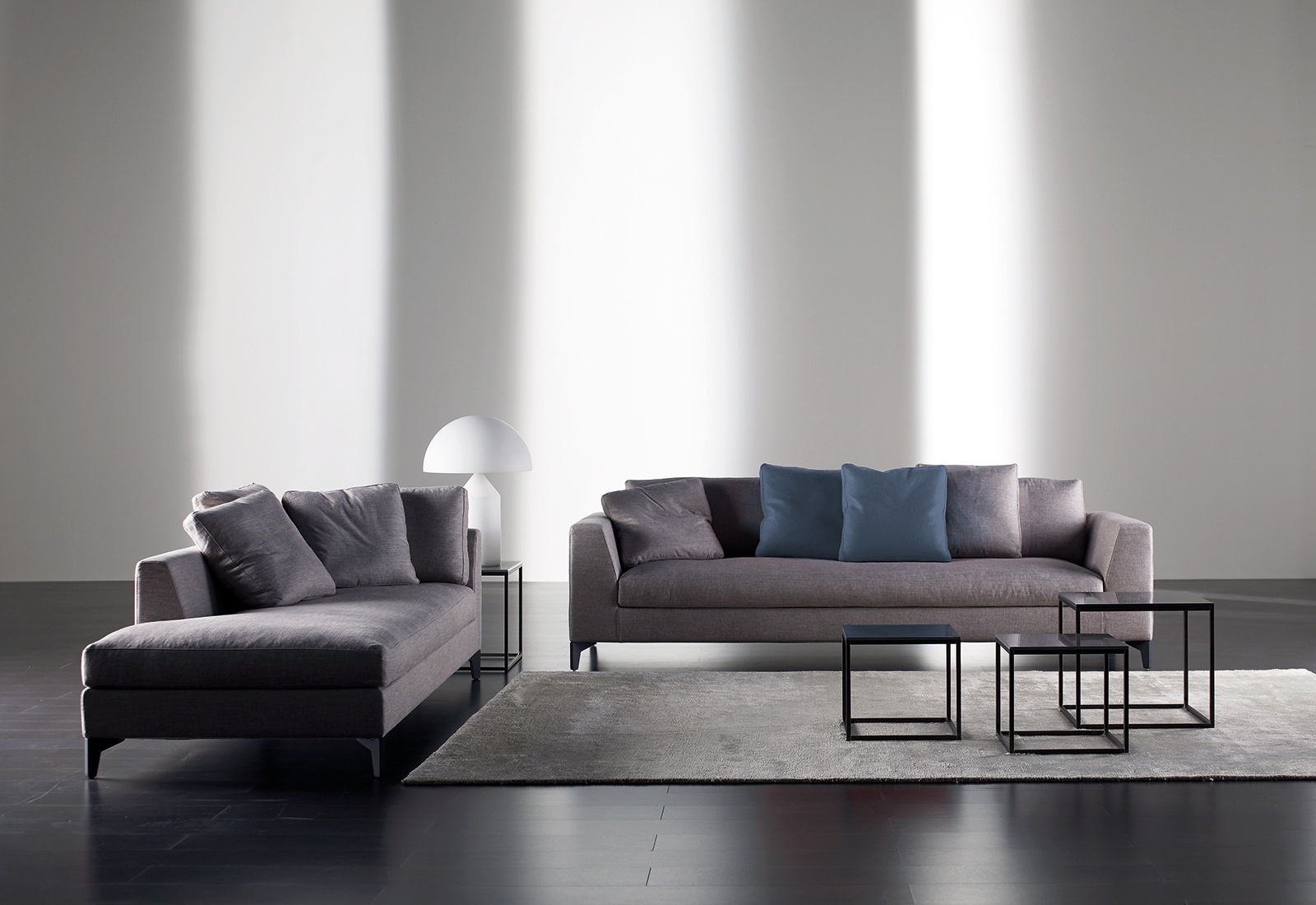 Double Lewis Up sofa from Italian manufacturer Meridiani. The frame and legs are made of metal and wood. Upholstery choice of leather or textile. The filler is polyurethane foam and goose down. Colours in stock. The contemporary style will create a cozy atmosphere in any interior.