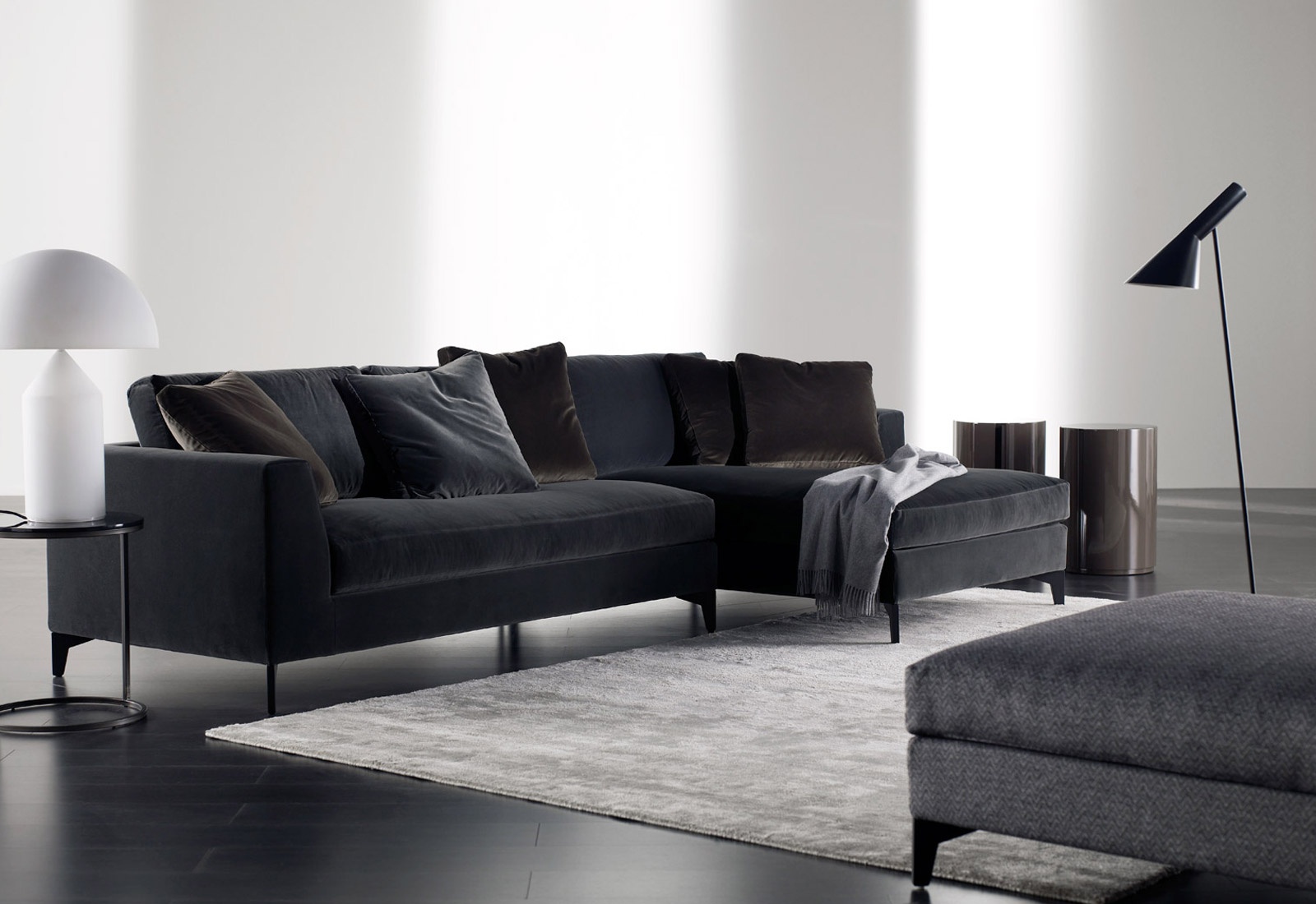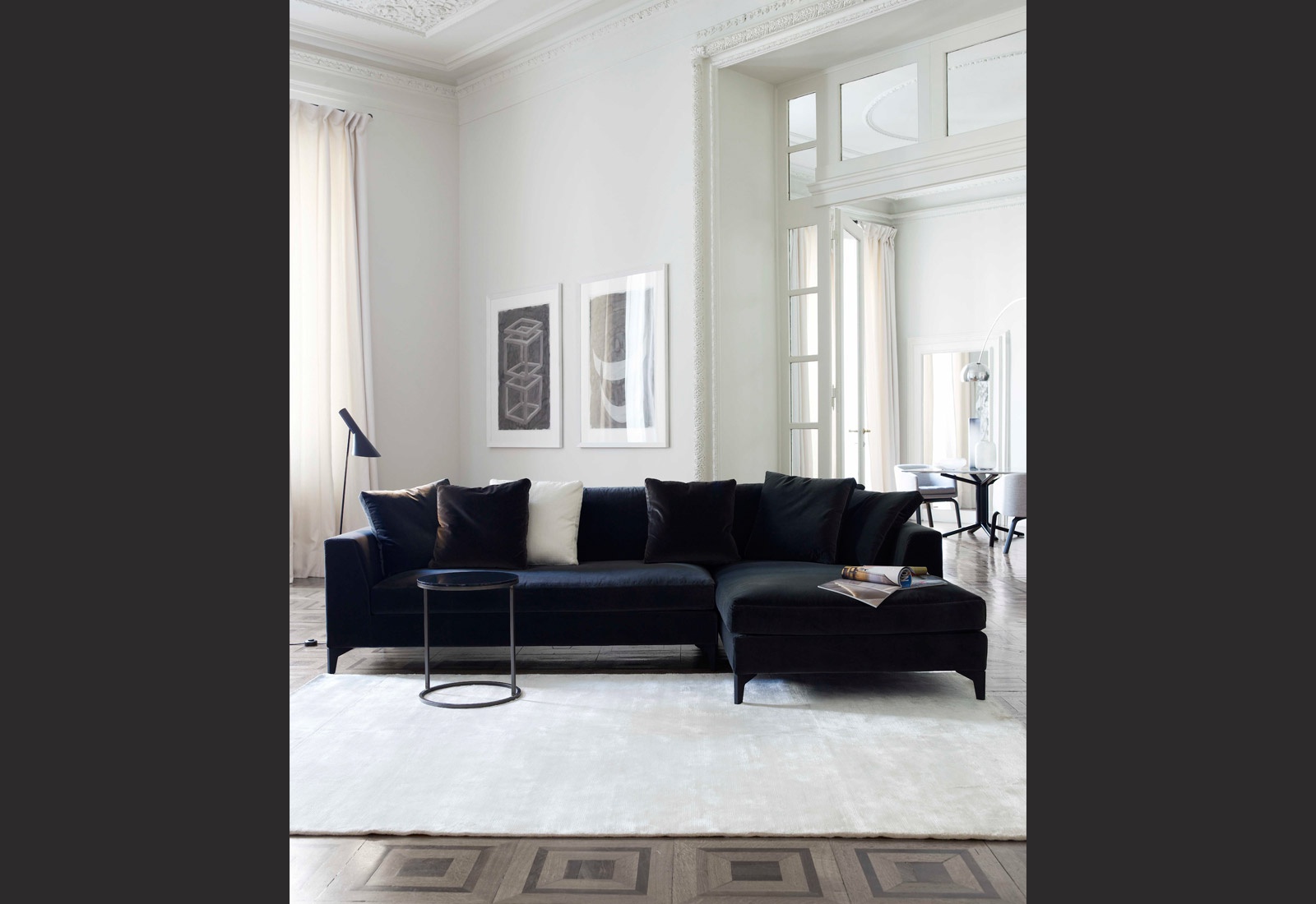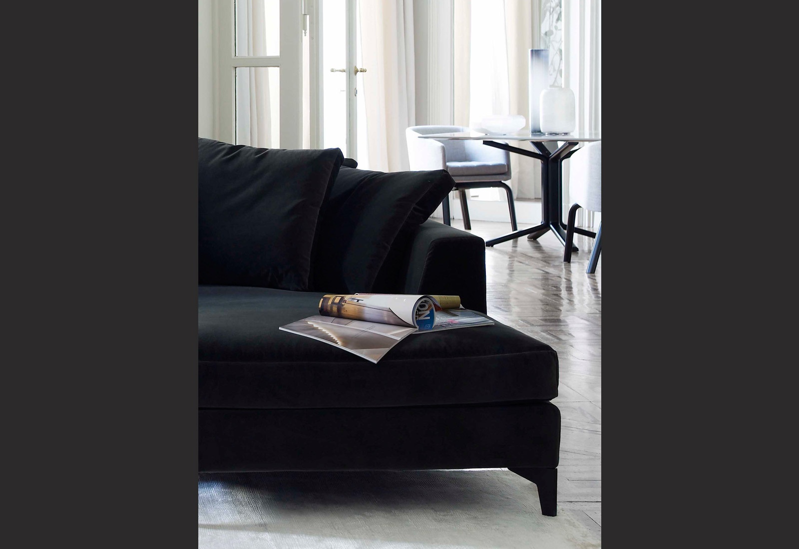 The Lewis Up modular sofa from Italian manufacturer Meridiani. The frame and legs are made of metal and wood. Upholstery textile or leather. The filler is polyurethane foam and goose down. Colours in stock. Design models complement the decorative pillows. The contemporary style will create a cozy atmosphere in any interior.