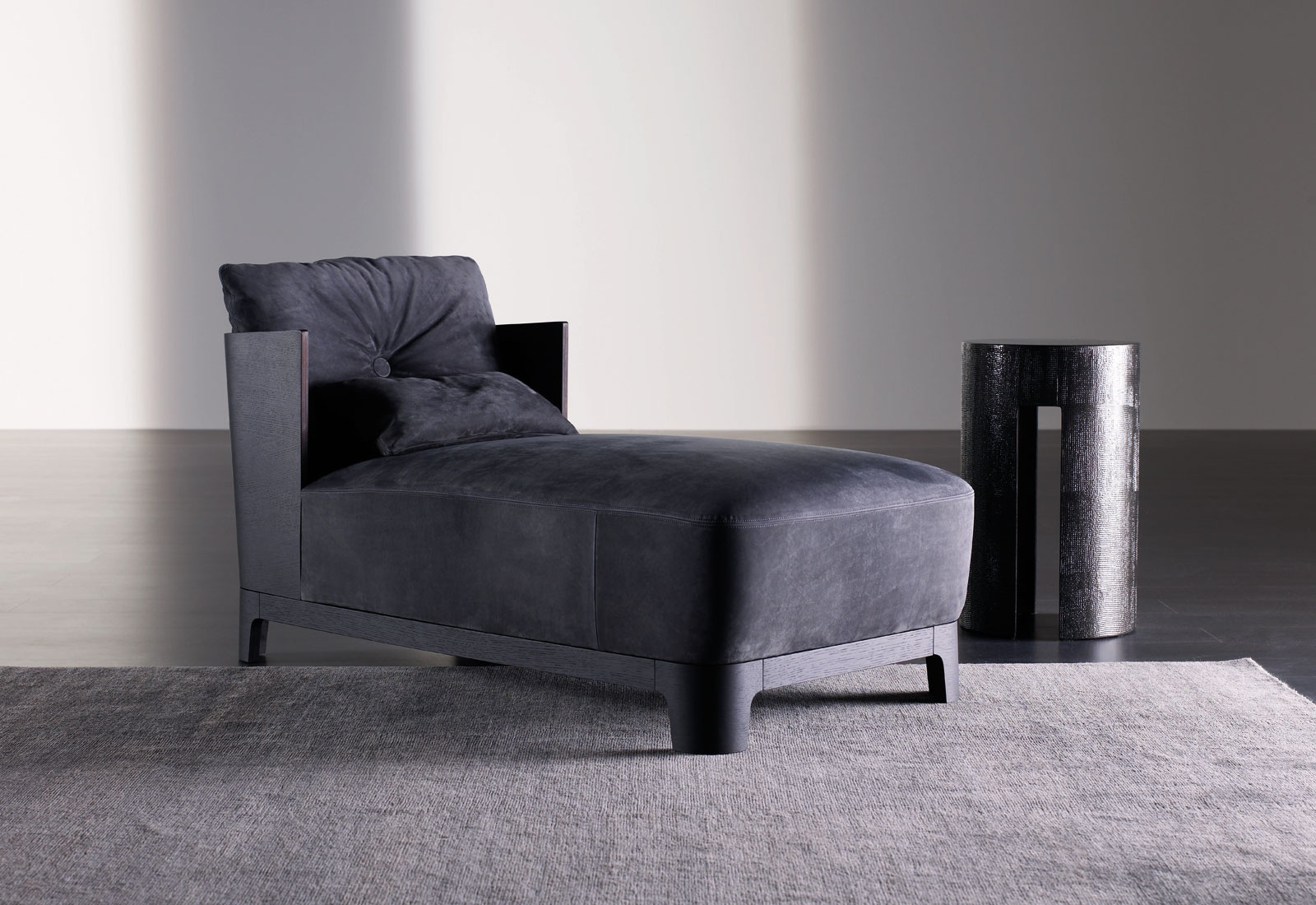 Keaton Wood chaise lounge from the Italian manufacturer Meridiani. Frame and backrest made of wood. Upholstery of textile or leather. Offers a wide range of color options. The filling for seat cushions and backrest in polyurethane and polyester fibre. The model is made in a modern style.