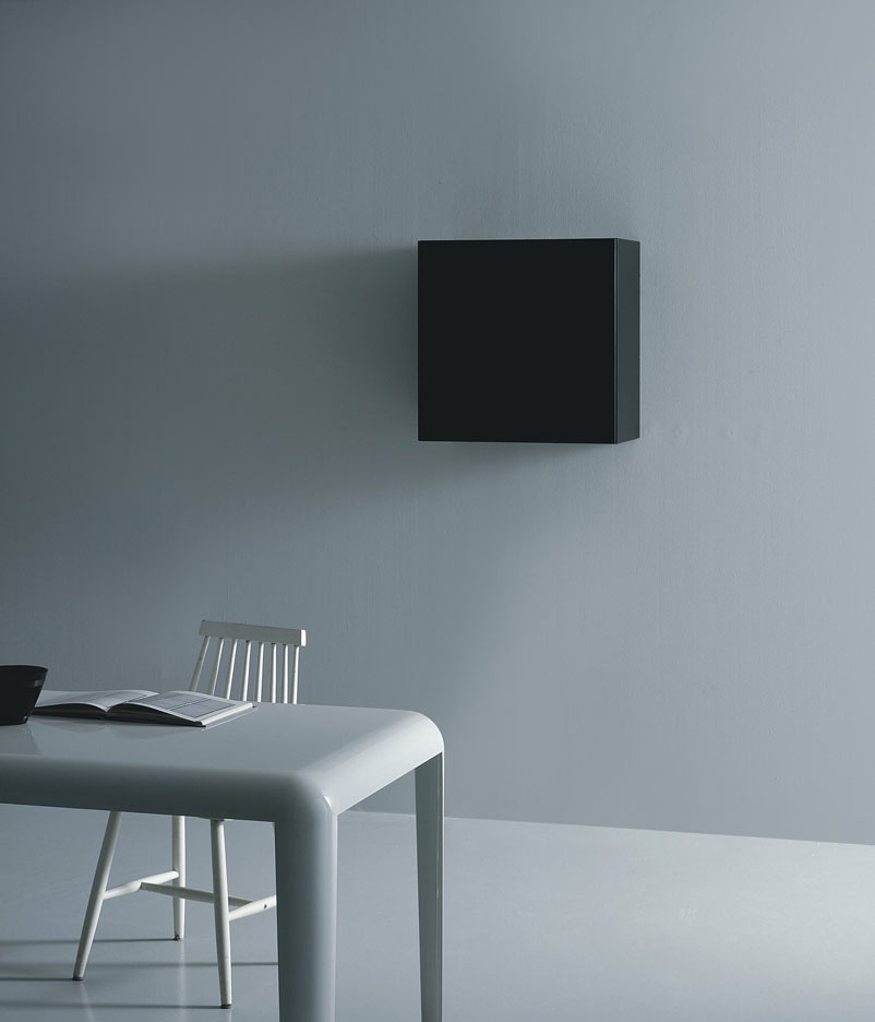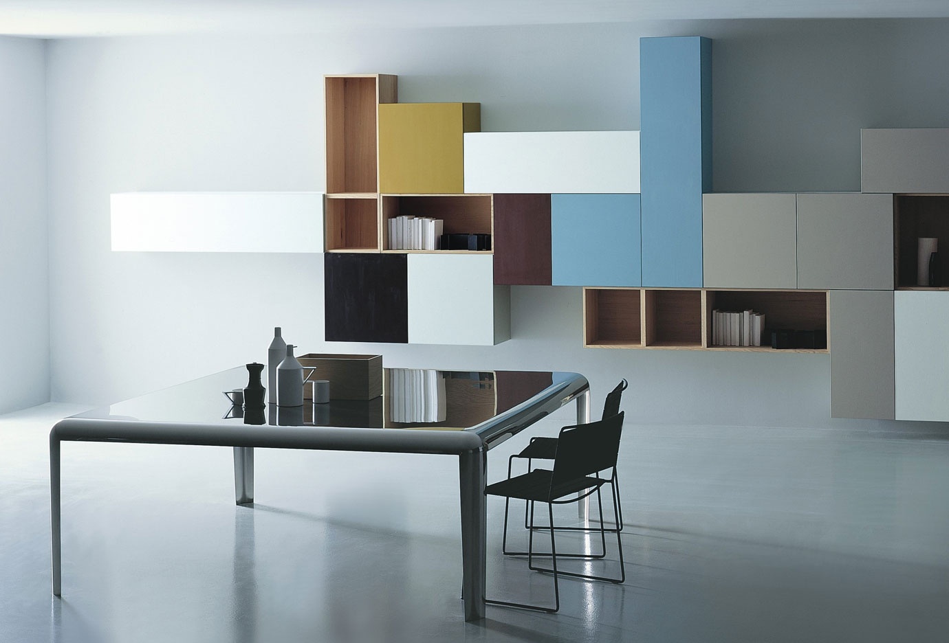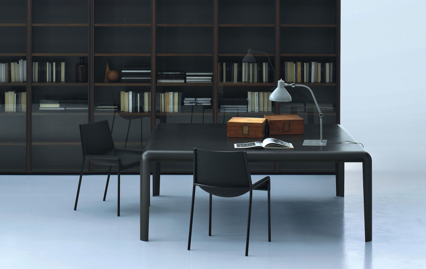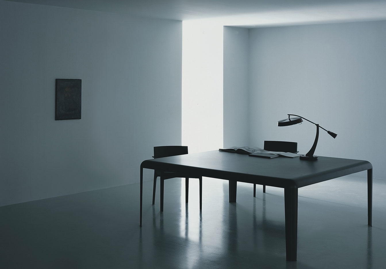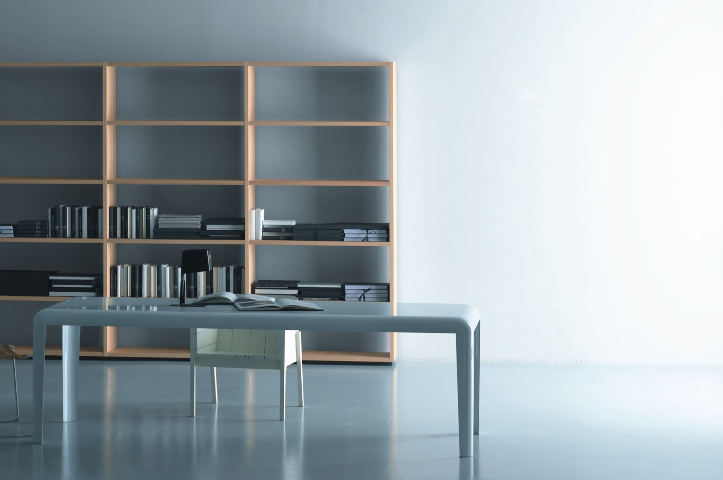 Table Ferro from Italian manufacturer Porro. Table made of bent sheet metal, painted in aluminum color, high gloss colored lacquer in black or white. The table on the polished aluminum frame.