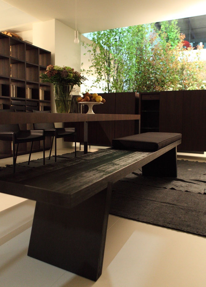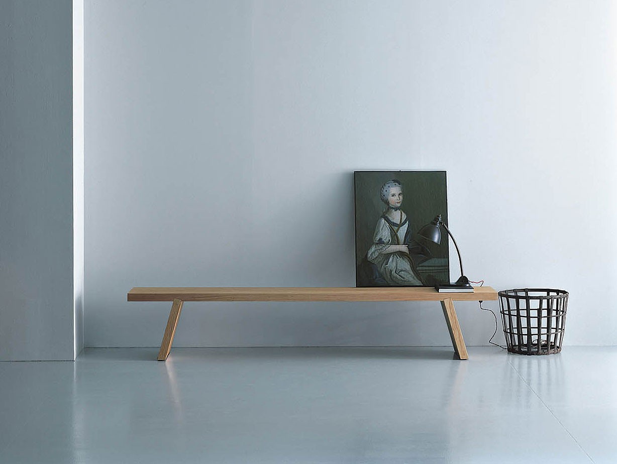 Bench made of natural wood Groove from the Italian manufacturer Porro. Bench from wood of firm breeds. Is characterized by simplicity of design and symmetry lines. The product consists of horizontal boards-seats, located on two inclined legs-grounds. The project kept to the minimum number of constituent elements to emphasize the texture of wood - Hemlock, a North American breed with "pure" pattern of veins and the characteristic white-yellow tint.
