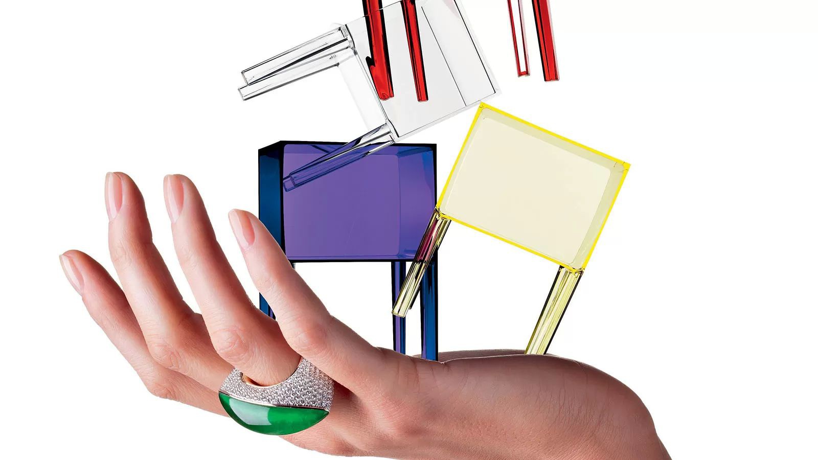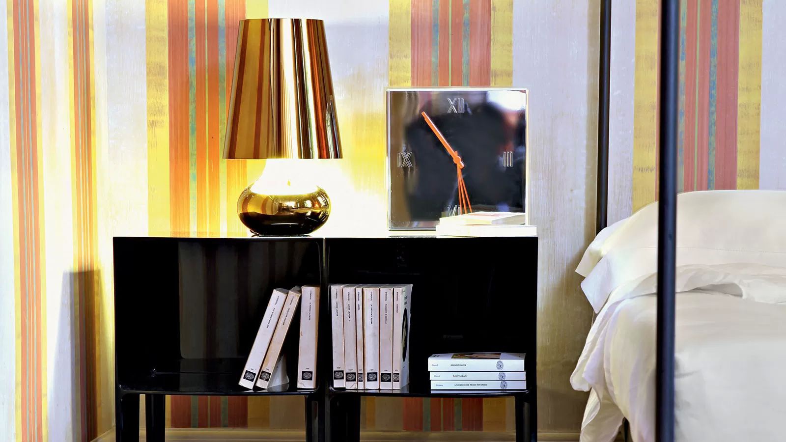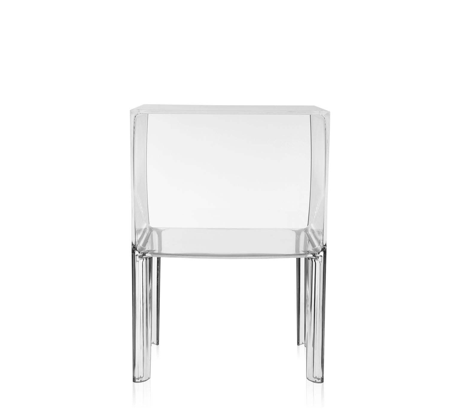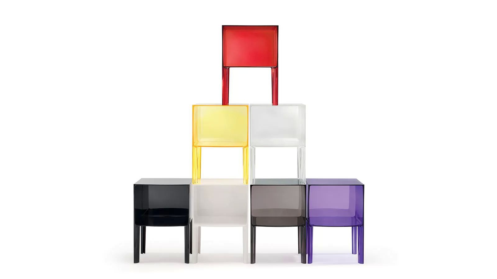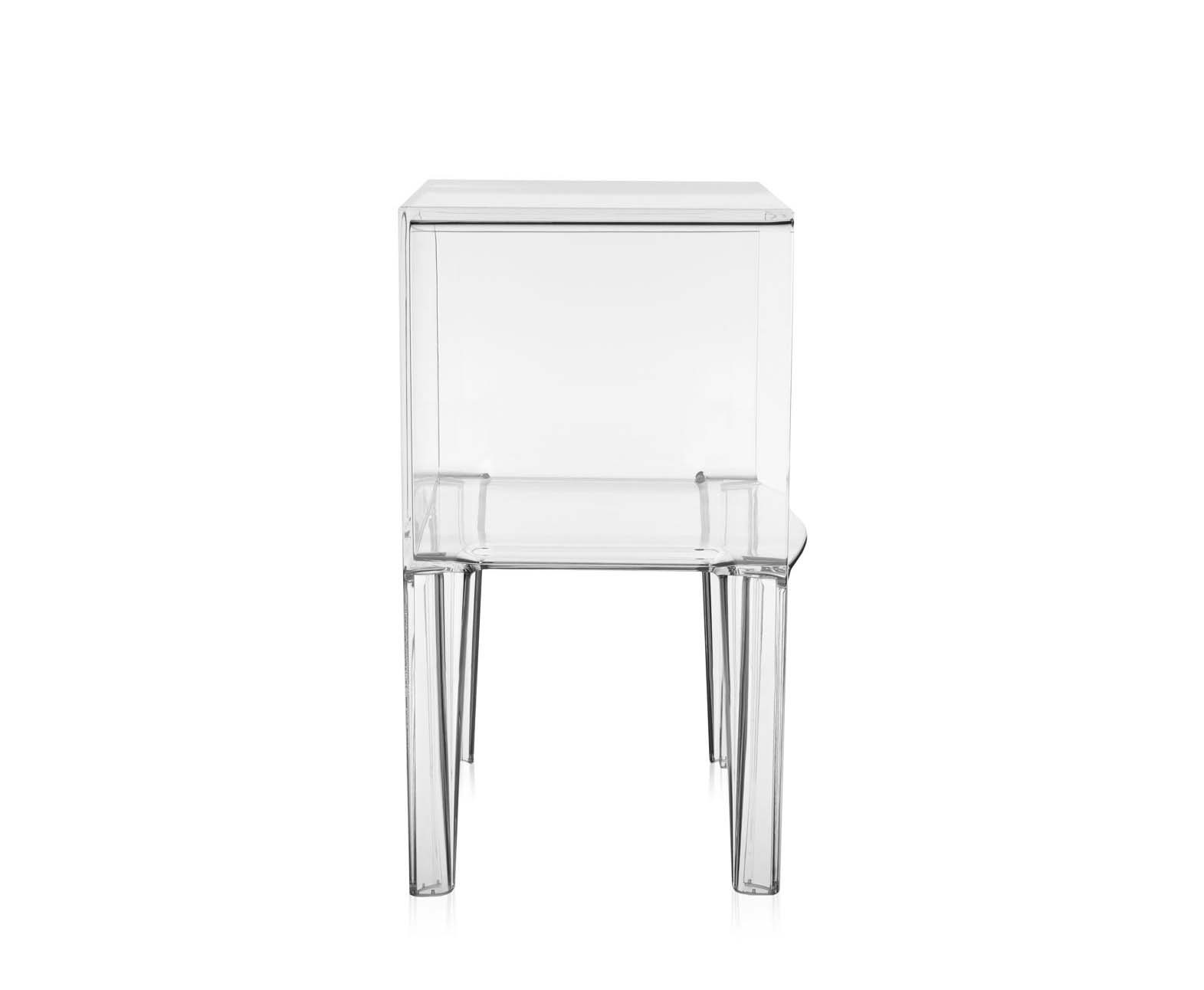 Bedside table Ghost Buster from the Italian manufacturer Kartell. Low bedside table with shelf-niche. Blends form, borrowed from classical models, and modern material - cast polymethylmethacrylate. Available in completely transparent, colorless form, justifying its name (the word Ghost in English means "Ghost") or transparent smoky grey / yellow / red / purple color. Also available in an opaque version of the model black / white color.