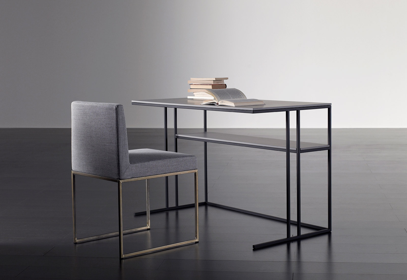 Desk Hardy from the Italian manufacturer Meridiani. Legs, frame - metal. Worktop - wood. Coated Matt or glossy lacquer. The model is simple and functional with an intermediate shelf. The modern design. Colours in stock.