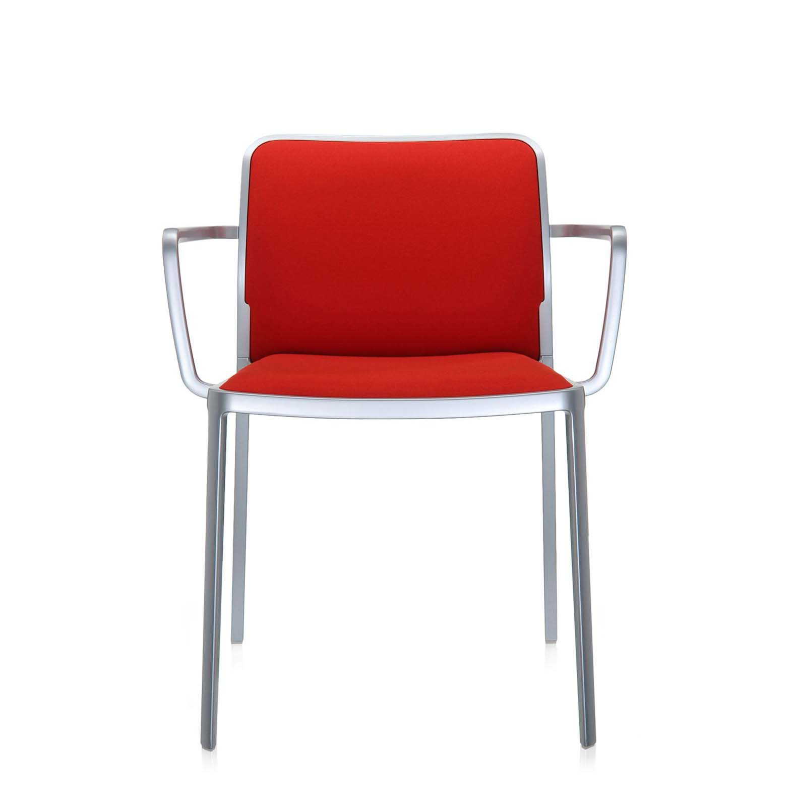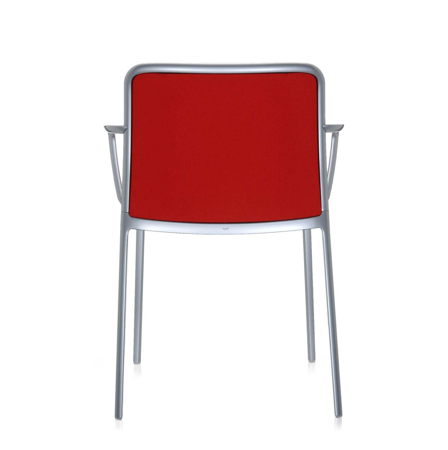 The Audrey Soft chair from the Italian manufacturer Kartell. Upholstered chair with armrests. The frame is made of cast aluminum. Seat and back upholstered in fabric Trevira. The model can be used in home or office interior as well as outdoors and in public places. Colours in stock.