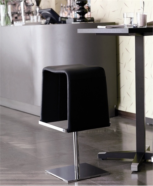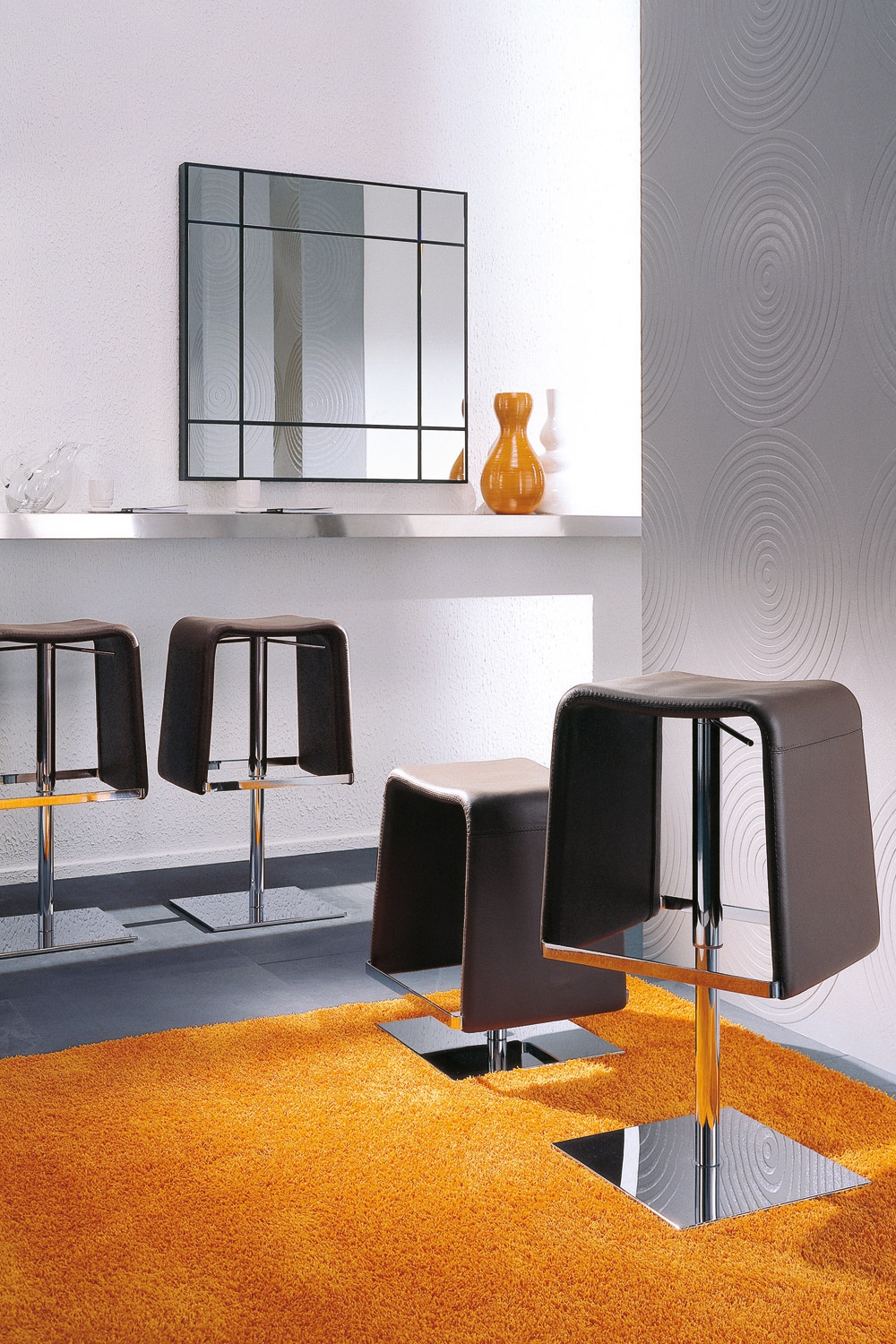 Brando bar stool sgabello from the Italian manufacturer Porada. Bar stool with foot rest on chrome-plated steel base. U-shaped seat is covered with leather or fabrics from the collection company or the customer's material. Model is height adjustable.
