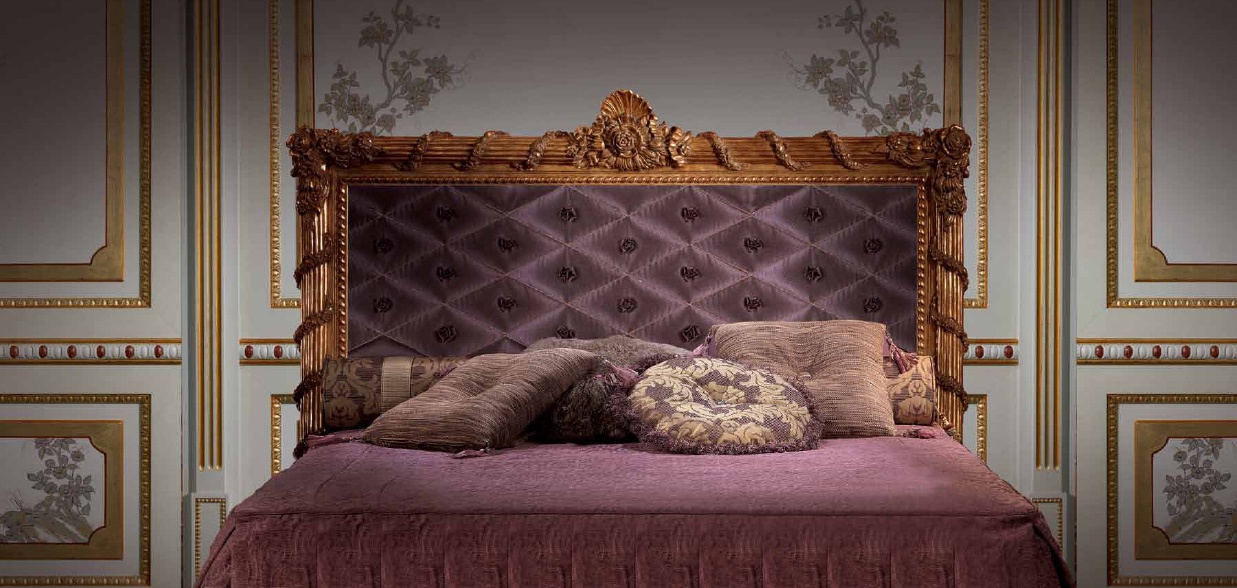 Double bed Minosse Italian manufacturer Zanaboni. Presents a model of double bed with rectangular headboard in a soft upholstery in a gold frame. The headboard is decorated with handmade carving. Color combination in purple and gold. A style classic.