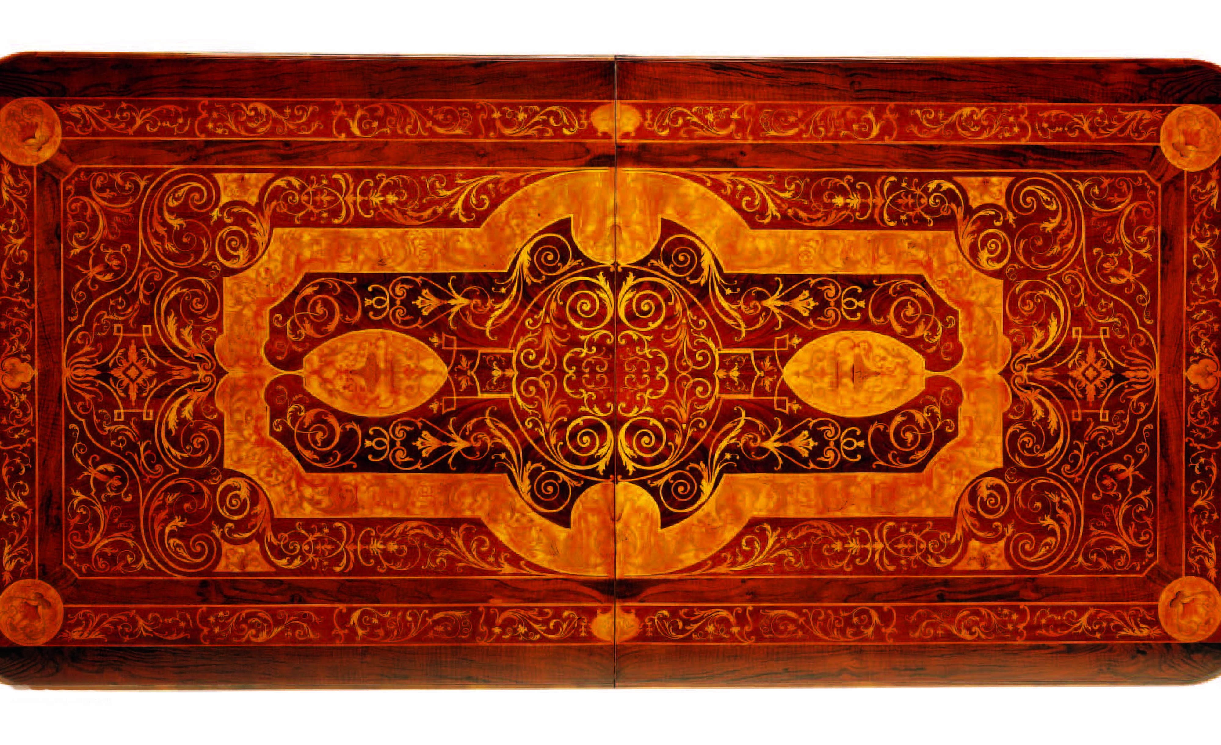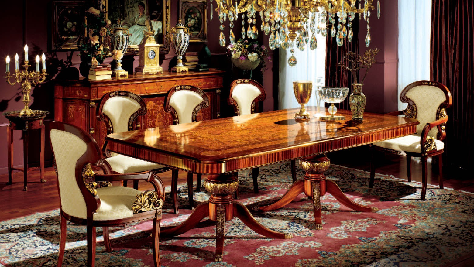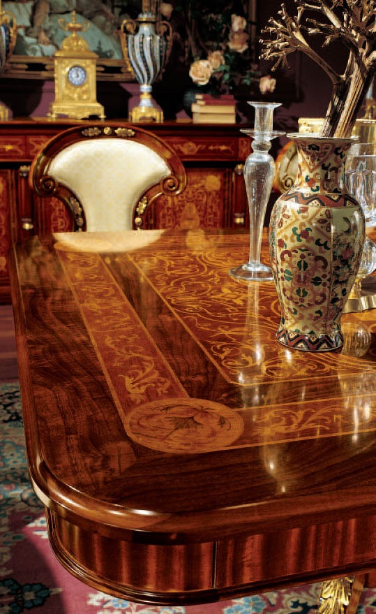 Folding dining table from Italian producer Armando Rho. The model is made from solid mahogany wood with inlay decoration in lacquer and antique gold. Inserts - an array of maple, walnut and pears. A perfect choice for a dining room in classical style. Colours in stock.