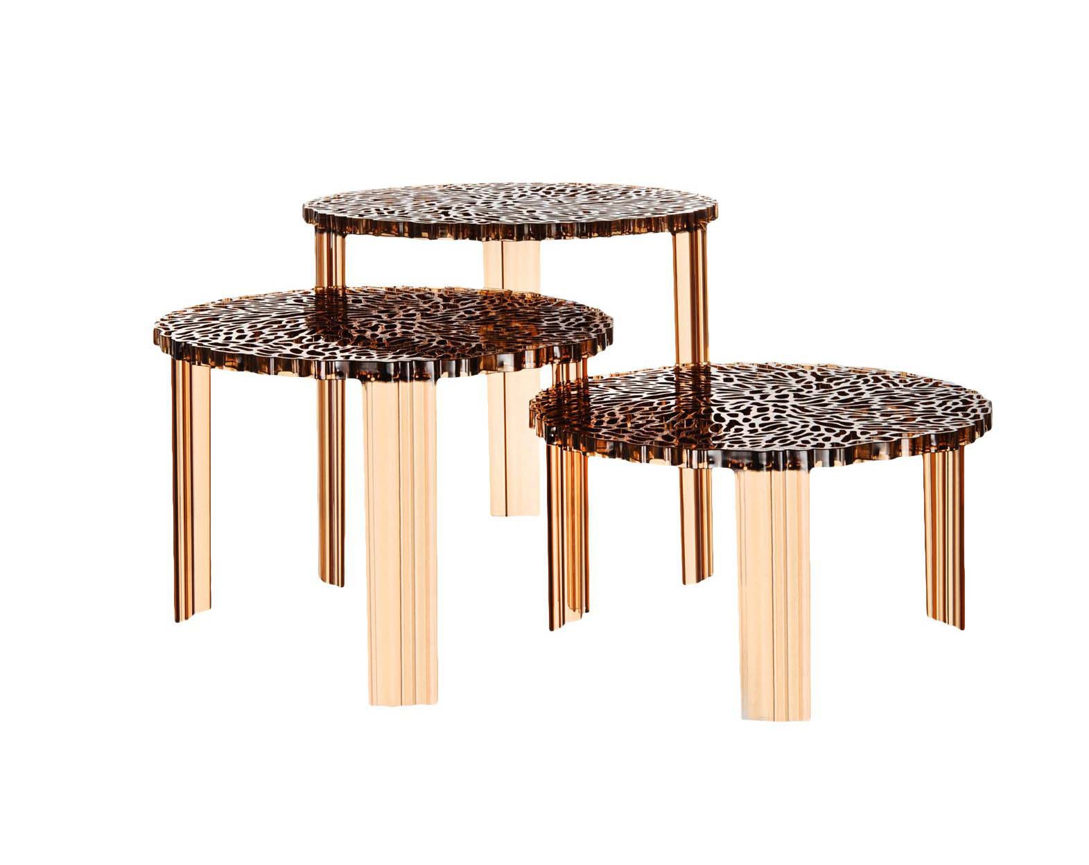 Coffee table T-Table from the Italian manufacturer Kartell. Line of tables created through the merger of creative imagination, Patricia Urquiola and Kartell unique technologies. The product is required the desire to search and research surfaces to achieve new visual and tactile effects. The slits on the surface of the tabletop T-Table form an elegant pattern resembling embroidery. It's poetic, feminine and extremely elegant piece is a result of scientific research and experiments in the field of technology. The product range consists of transparent, translucent and opaque colour options with three different heights.
