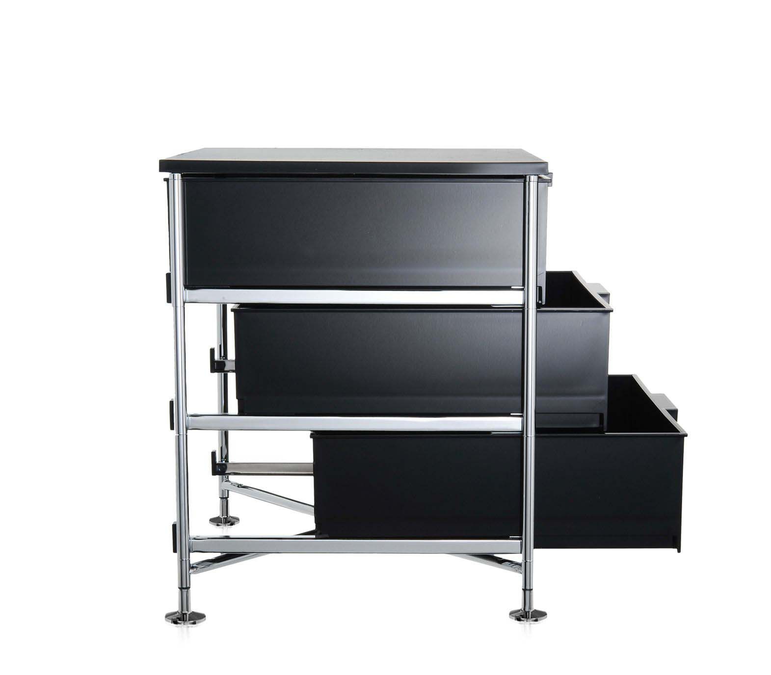 Frame - chrome-plated steel. Containers and shelves are transparent or coloured shock-resistant polymethylmethacrylate (PMMA). Model with three drawers. Colours in stock.