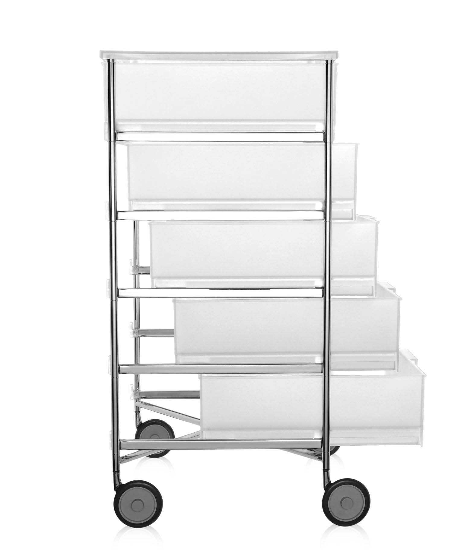 The Mobil chest of drawers from Italian manufacturer Kartell. Frame - chrome-plated steel. Containers and shelves are transparent or coloured shock-resistant polymethylmethacrylate (PMMA). The model will perfectly complement a contemporary bedroom interior. Colours in stock.