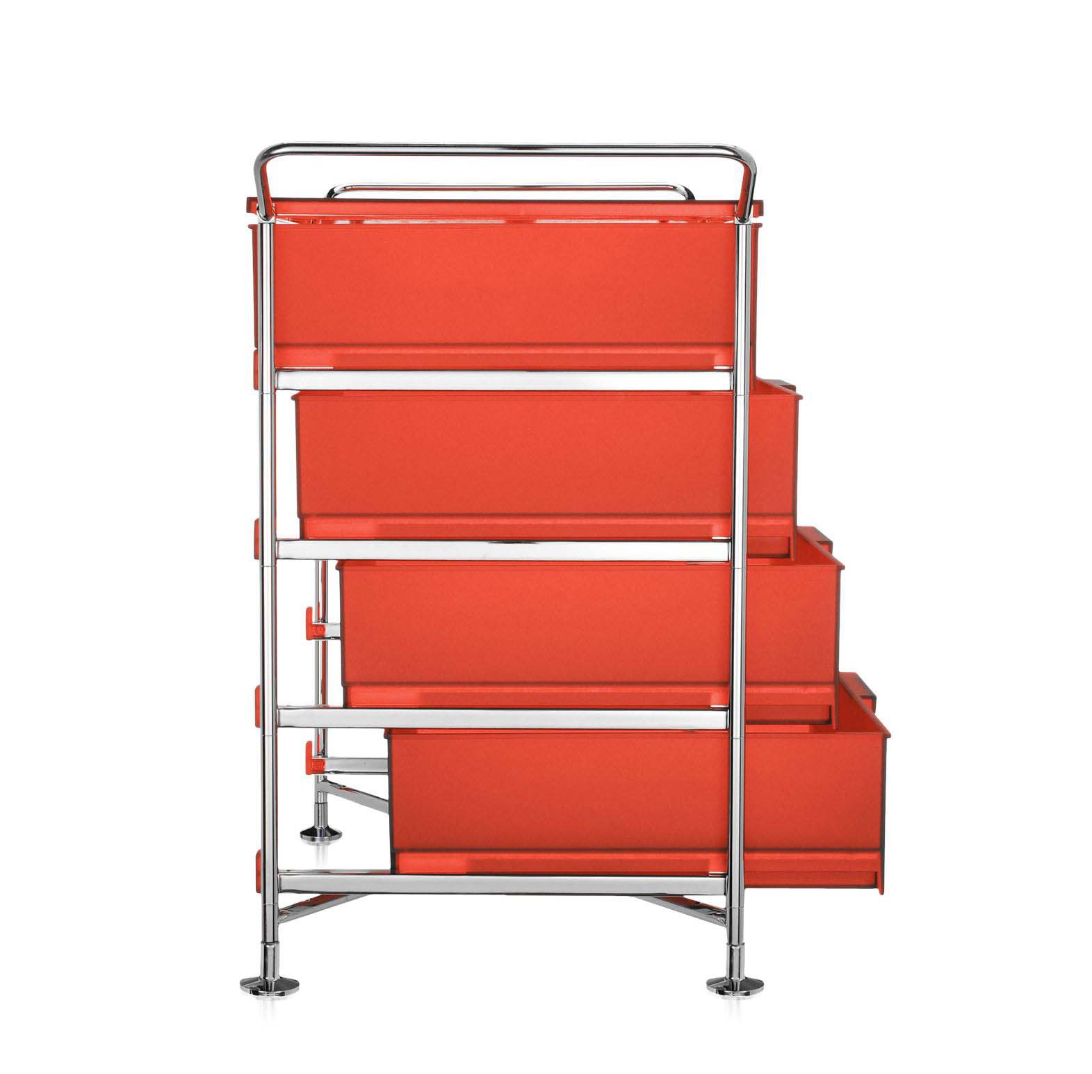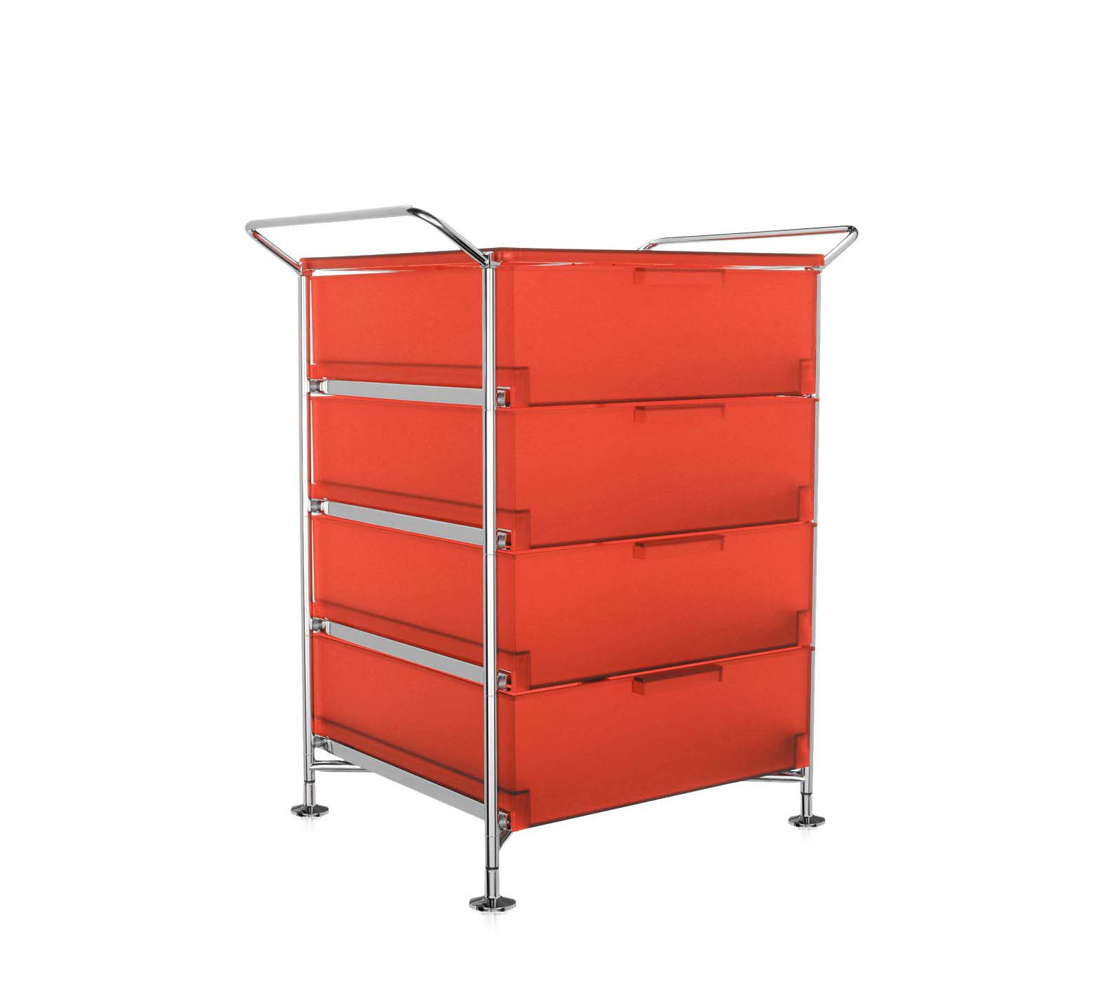 The Mobil chest of drawers from Italian manufacturer Kartell. Containers and shelves are transparent or coloured shock-resistant polymethylmethacrylate (PMMA). The frame is made of steel. The model is made in a modern style, combines tradition and design. Colours in stock.