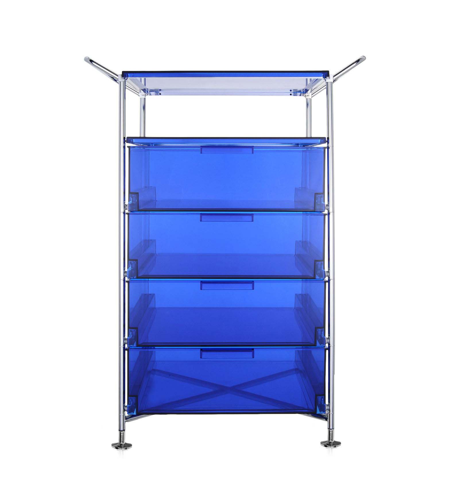 The Mobil chest of drawers from Italian manufacturer Kartell. Containers and shelves are transparent or coloured shock-resistant polymethylmethacrylate. The frame is made of chrome steel. The model is made in a modern style, combines tradition and design. Colours in stock.