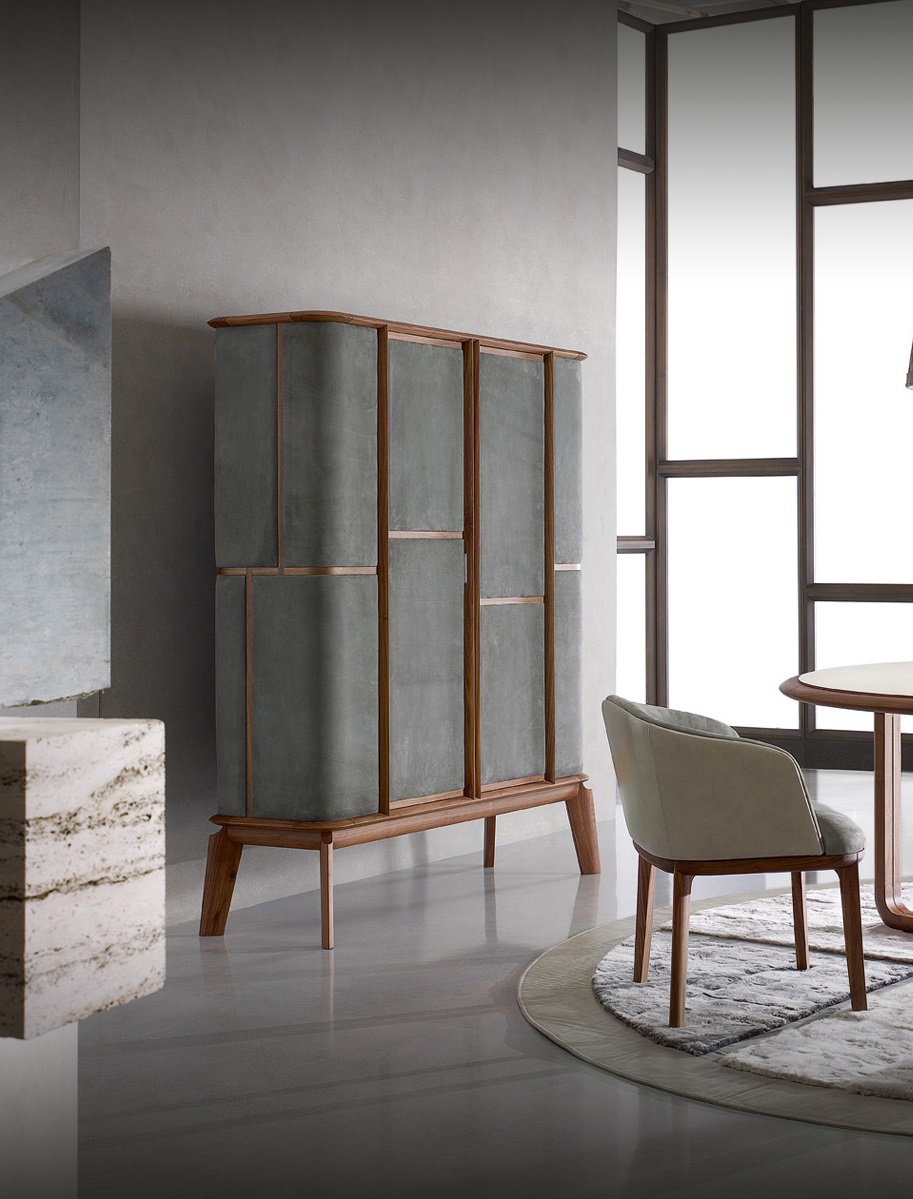 The rack bar Matthias Bar from the Italian manufacturer Ulivi. The frame is made of wood. Model with rounded corners. Trim presents high quality suede. Made in a modern style. Colors the product presents a combination of light grey with a hint of natural wood, but you may choose the catalog of the manufacturer. Included in the dining set collection My Luxury.