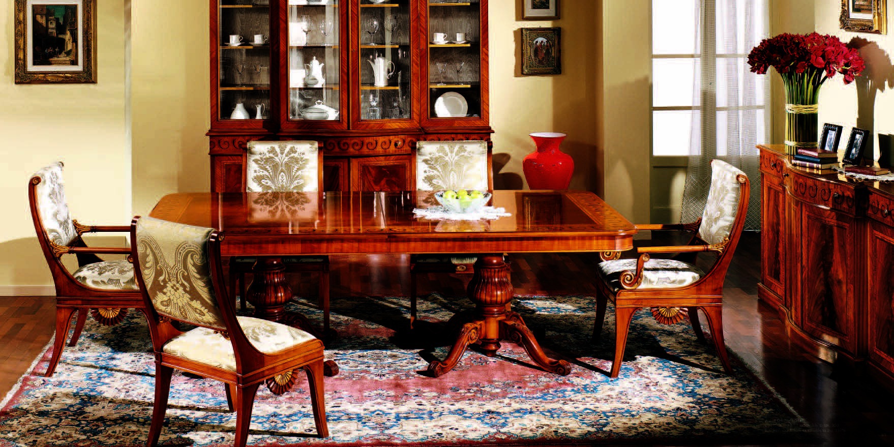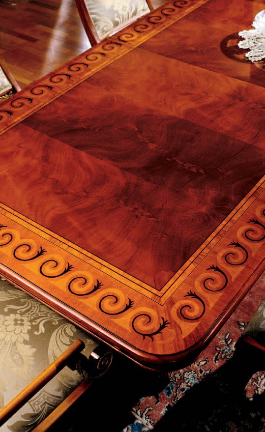 Folding dining table from Italian producer Armando Rho. Model in the classic style. Made of solid mahogany wood, decorative inserts made of olive wood and maple. The table top is decorated with inlay. Lacquer finish and antique gold. Colours in stock.